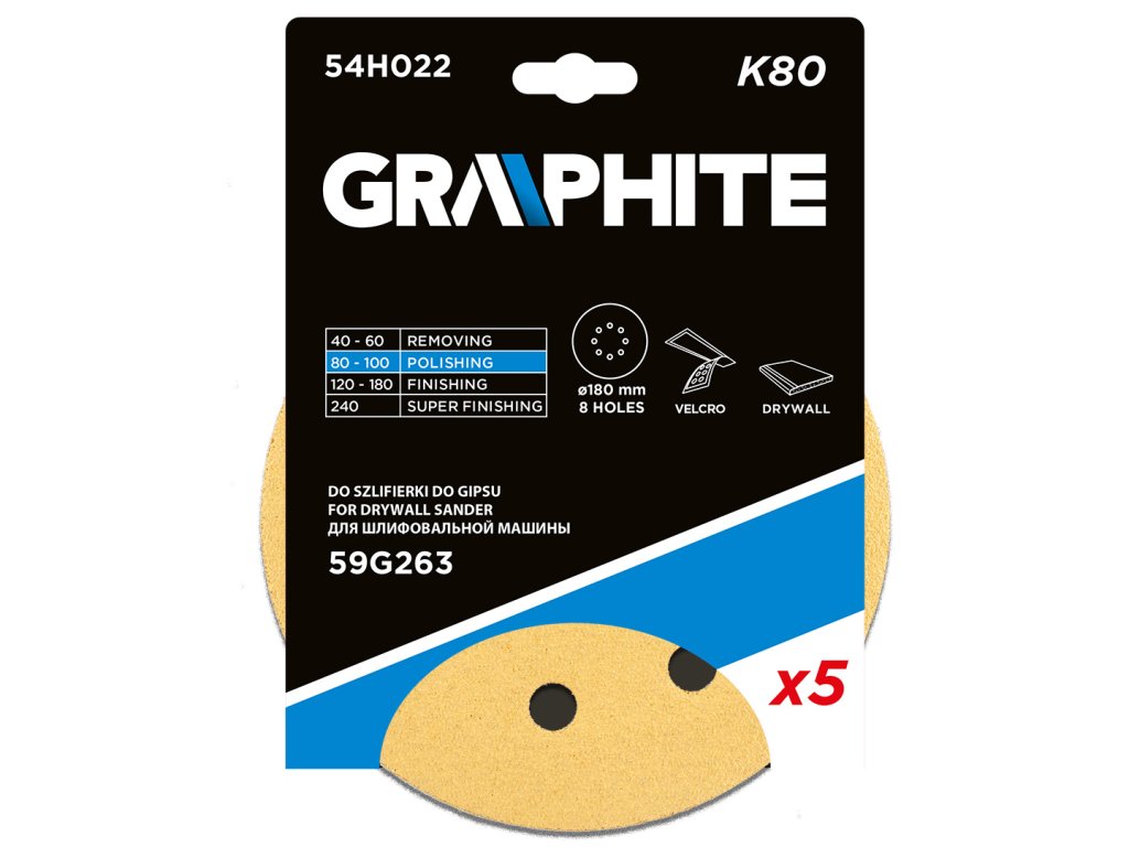 Brúsny kotúč na suchý zips 180 mm, K80, 5 ks, s 8 otvormi pre brúsku 59G263, 54H022 GRAPHITE s priemerom 180 mm a triedením K80. Balenie obsahuje päť kusov kotúčov určených pre brúsku na omietky 59G263 GRAPHITE. Príslušenstvo má 8 praktických otvorov s rozstupom 110 mm. Kotúče so suchým zipsom sú vyrobené z papiera typu C. Vyznačujú sa polootvorenou zrnitosťou a zrnom z elektrokorundu. Budú vhodné na profesionálne použitie aj na úlohy pre domácich majstrov.