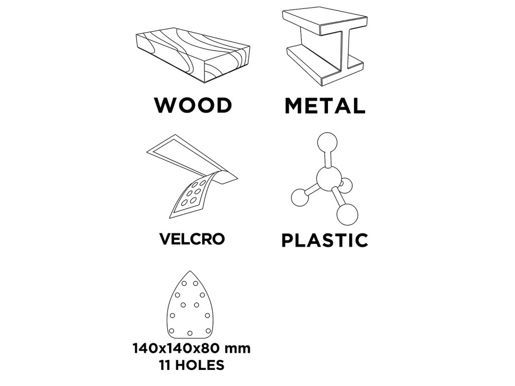 Brúsny papier na suchý zips delta 140 x 140 x 80 mm, K 100, 5 ks. 54H012 od GRAPHITE s rozmermi 140x140x80 mm. Vyznačuje sa stupňom 100 a je určený pre delta orbitálne brúsky (napr. brúska GRAPHITE 59G336). Papier sa odporúča používať na drevo, kov a plast. Upevnenie na suchý zips uľahčuje efektívnu a rýchlu výmenu. Papier má otvory na odsávanie prachu, čo umožňuje pohodlnú bezprašnú prácu, a teda efektívnejšie brúsenie bez prehrievania materiálu. Sada 5 brúsnych papierov 140x140x80 mm sa odporúča pre profesionálov a skúsených domácich majstrov.