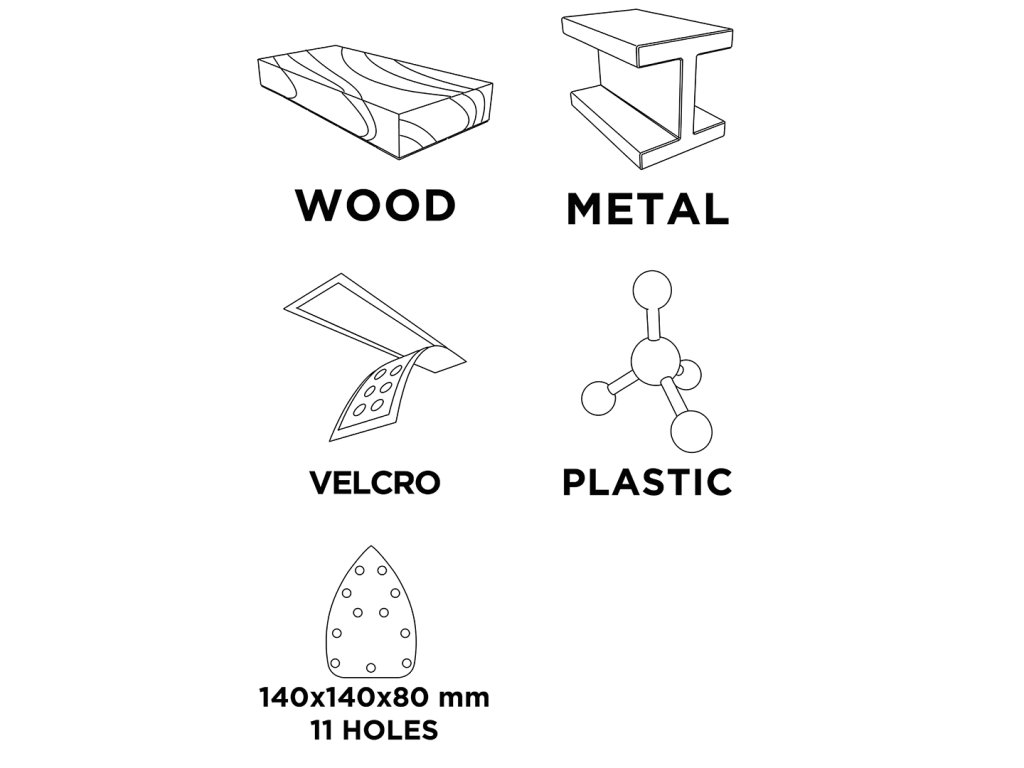 Brúsny papier na suchý zips delta 140 x 140 x 80 mm, K 240, 5 ks s otvormi 54H015 od GRAPHITE s rozmermi 140x140x80 mm. Vyznačuje sa stupňovitosťou 240 a je určený pre delta orbitálne brúsky (napr. brúska GRAPHITE 59G336). Papier sa odporúča používať na drevo, kov a plast. Upevnenie na suchý zips uľahčuje efektívnu a rýchlu výmenu. Papier má otvory na odsávanie prachu, čo umožňuje pohodlnú bezprašnú prácu, a teda efektívnejšie brúsenie bez prehrievania materiálu. Sada 5 brúsnych papierov 140x140x80 mm sa odporúča pre profesionálov a skúsených domácich majstrov.