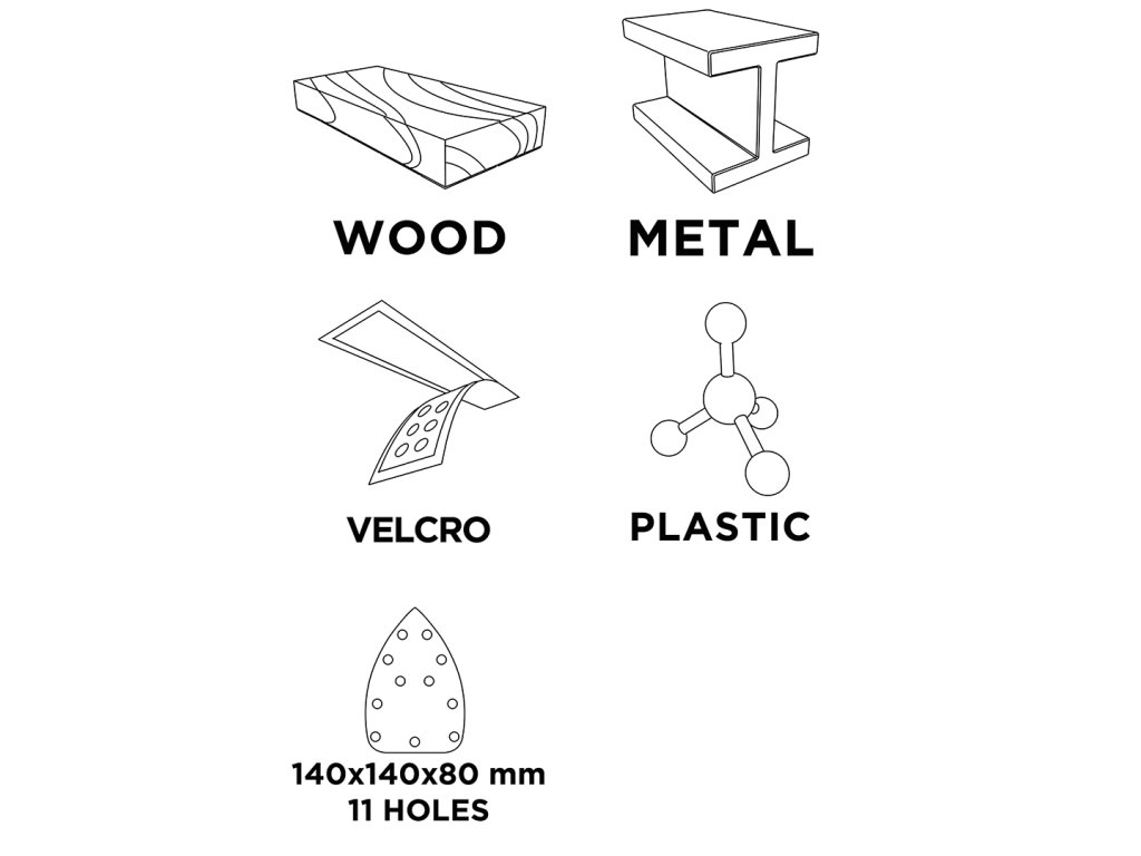 Brúsny papier na suchý zips delta 140 x 140 x 80 mm, K 80, 5 ks. 54H011 od GRAPHITE s rozmermi 140x140x80 mm. Vyznačuje sa stupňom 80 a je určený pre delta orbitálne brúsky (napr. brúska GRAPHITE 59G336). Papier sa odporúča používať na drevo, kov a plast. Upevnenie na suchý zips uľahčuje efektívnu a rýchlu výmenu. Papier má otvory na odsávanie prachu, čo umožňuje pohodlnú bezprašnú prácu, a teda efektívnejšie brúsenie bez prehrievania materiálu. Sada 5 brúsnych papierov 140x140x80 mm sa odporúča pre profesionálov a skúsených domácich majstrov.
