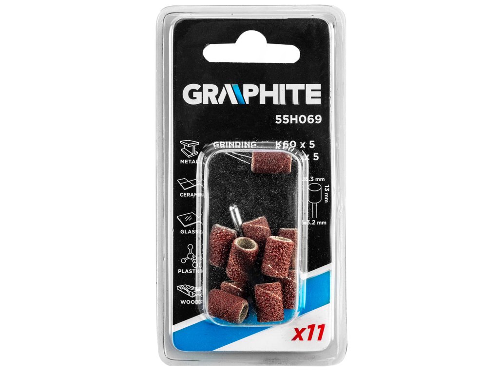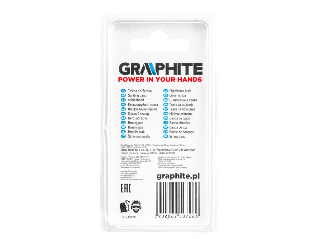 Brúsny pás GRAPHITE (ref. 55H069) je súprava 10 kusov brúsnych pásov pre minibrúsku s priemerom 6,3 mm a gradáciou K60 a K120. Vhodný na brúsenie, tvarovanie a prípravu povrchov z kovu, zliatin, keramiky, dlaždíc, kameňa, skla, plastov a sklenených vlákien. Môže sa používať aj na odstraňovanie hrdze a zdrsňovanie povrchu.