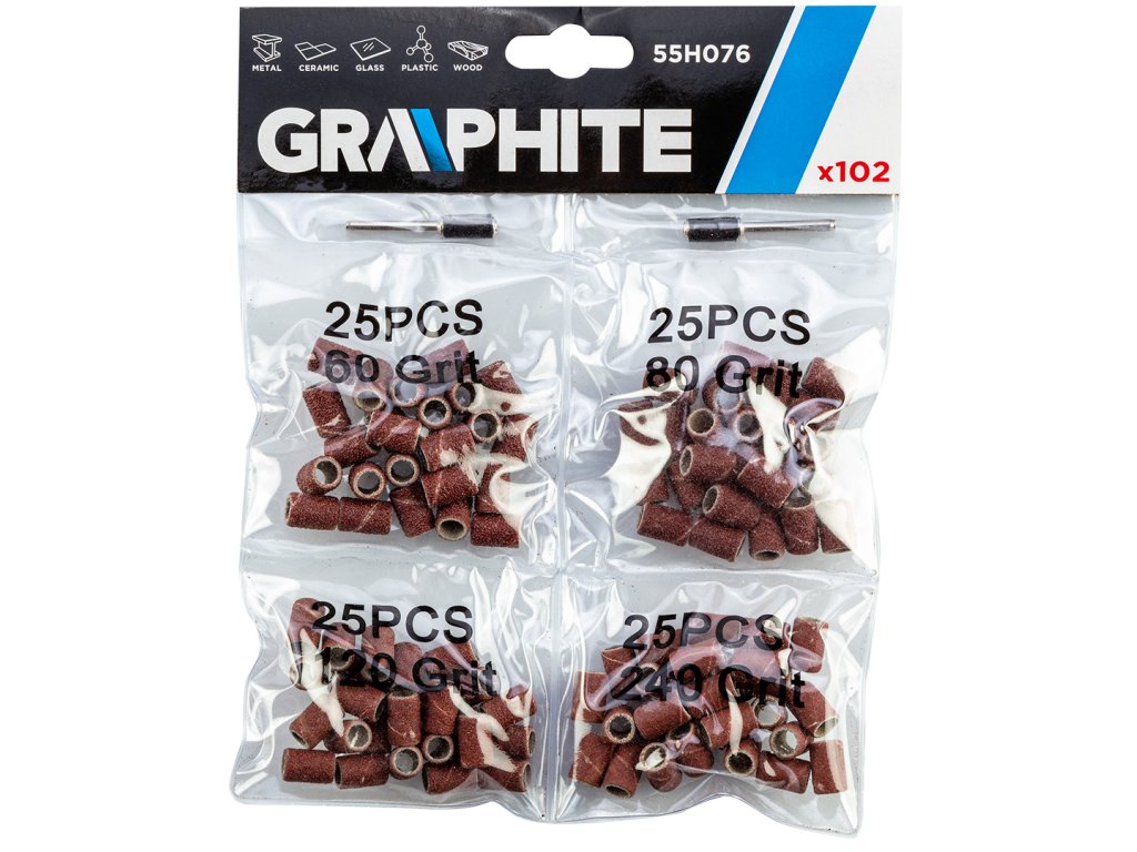 Brúsny pás GRAPHITE (ref. 55H076) s priemerom 6,3 mm a odstupňovaním: K60, K80, K120 a K240. Určené na použitie s minibrúskou. Vhodný na brúsenie, tvarovanie a prípravu povrchov z kovu, keramiky, dlaždíc, kameňa, skla, plastu a sklených vlákien.