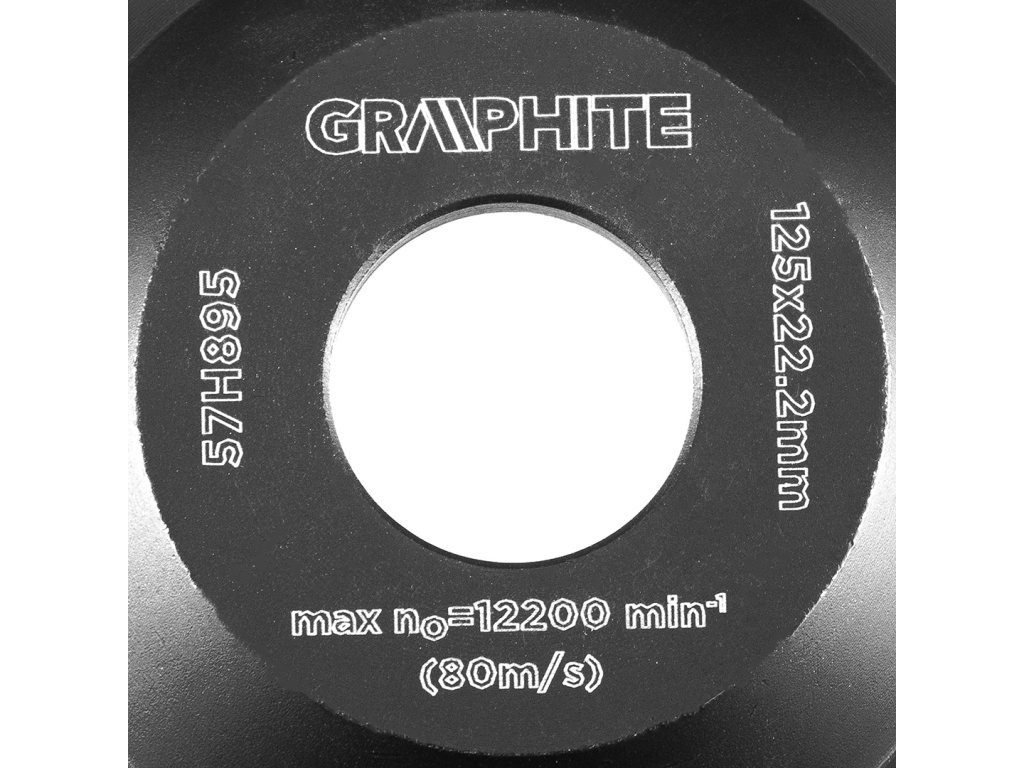 Diamantový brúsny kotúč 125 x 22,2 x 5 mm, segment C 57H895 GRAPHITE je diamantový kotúč určený na tvrdé materiály, najmä na betón a kameň. Má priemer 125 mm a segment C, vďaka čomu je vhodnejší na dosiahnutie rýchlych výsledkov. Disk sa pomaly zahrieva vďaka rozptylu tepla. Maximálna rýchlosť je 80 m/s. Ideálne na rezanie a brúsenie.