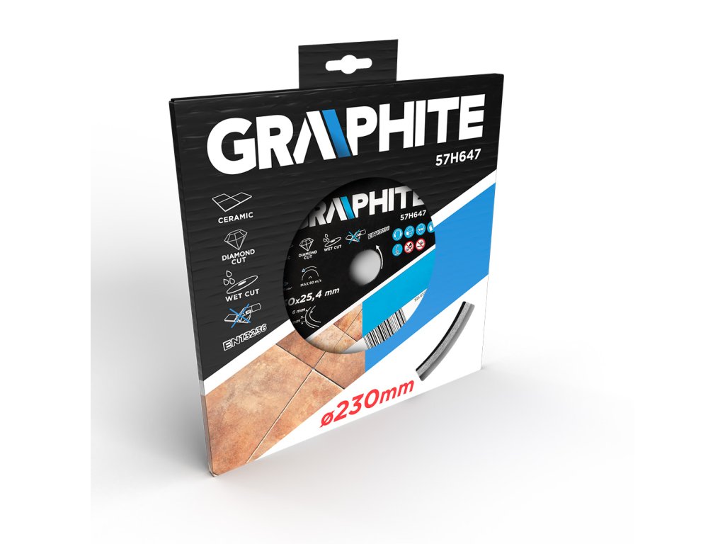 Diamantový kotúč 230 x 25,4 mm, pevný pre 59G891, 57H647 od GRAPHITE s priemerom kotúča 230 mm a priemerom otvoru 25,4 mm je určený pre rezačku obkladačiek GRAPHITE 59G891. So svojím za tepla lisovaným priebežným segmentom je ideálny na ťažké a náročné stavebné práce. Robustný diamantový segment s výškou 6 mm a hrúbkou 2,4 mm umožňuje rezanie keramických komponentov, ako je terakota. Kotúč sa odporúča na mokré rezanie pri maximálnych otáčkach 6 600 ot/min.