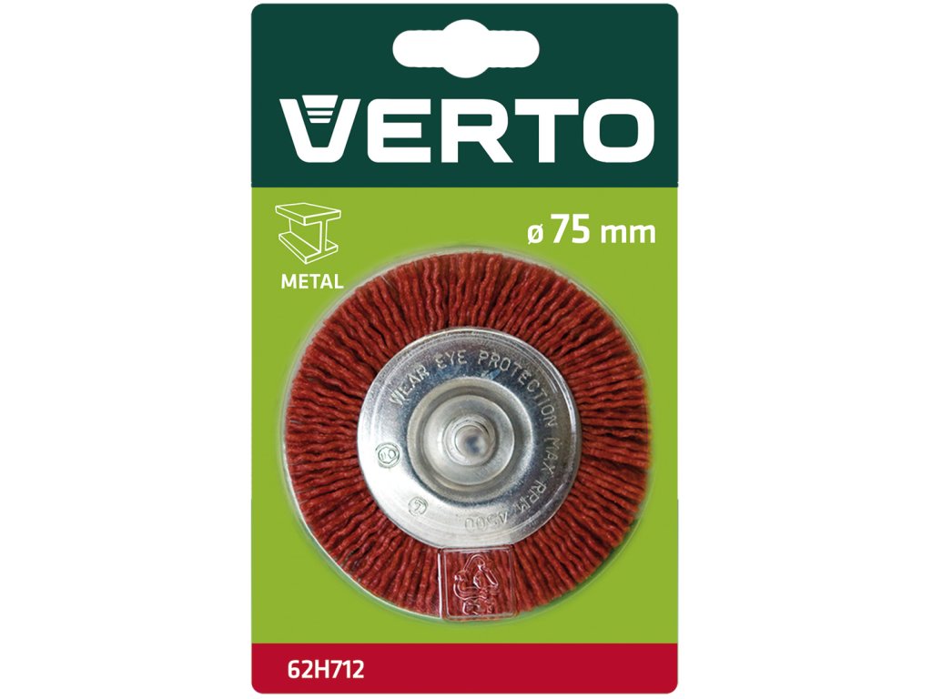 brúsna kefa VERTO (ref. 62H712) s priemerom 75 mm, ktorá sa používa na čistenie kovových a drevených povrchov pomocou vŕtačky. Tŕň s priemerom 6 mm umožňuje montáž kefy do vretien vŕtačiek a skrutkovačov. Abrazívny materiál vložený do nylonového vlasu kefy umožňuje efektívne, ale zároveň veľmi šetrne odstraňovať nečistoty, nátery a hrdzu. Značka VERTO ponúka sortiment elektrického náradia a príslušenstva pre každého domáceho majstra.