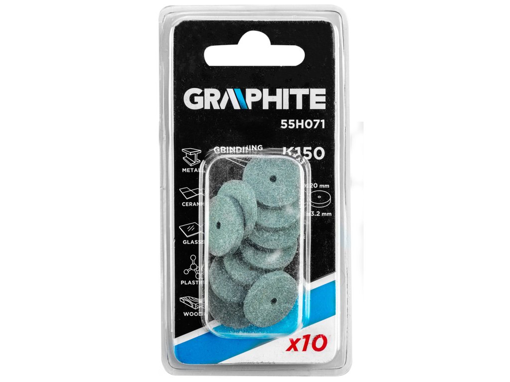 Brúsny kotúč GRAPHITE Alumina (ref. 55H071) s vonkajším priemerom 20 mm, vyrobený z karbidu kremíka. Sada obsahuje 10 kotúčov, ktoré sú vhodné na brúsenie liatiny, ocele, ocele a kovu, dreva, plastu.