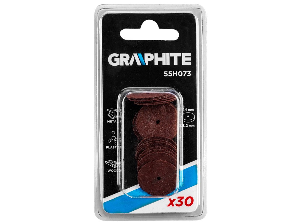 GRAPHITE Corundum Disc (ref. 55H073) je sada 30 kusov kotúčov s priemerom 24 mm na rezanie rôznych materiálov. Korundový kotúč rozreže aj ten najtvrdší stavebný materiál. Vhodný na orezávanie, odstraňovanie otrepov a brúsenie drahých a nedrahých kovov, obkladačiek, kameňa, keramiky, skla, plastov, sklených vlákien a dreva.