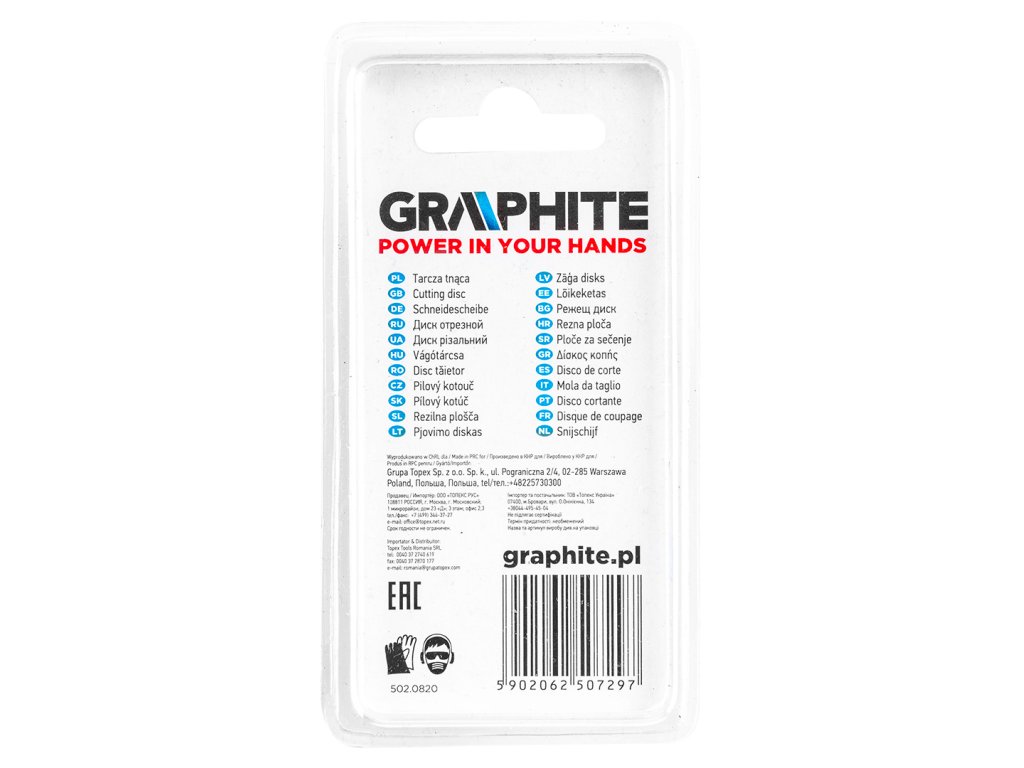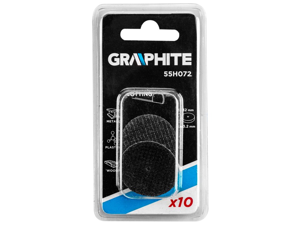 GRAPHITE kotúč vystužený oxidom hlinitým (ref. 55H072) je sada 10 kotúčov vystužených sklenými vláknami a živicou s priemerom 32 mm. Sú flexibilné a vďaka živici majú vysokú reznú kapacitu a dlhú životnosť. Sú vhodné na orezávanie a odihlovanie drahých a nedrahých kovov, plastov, sklených vlákien a dreva.