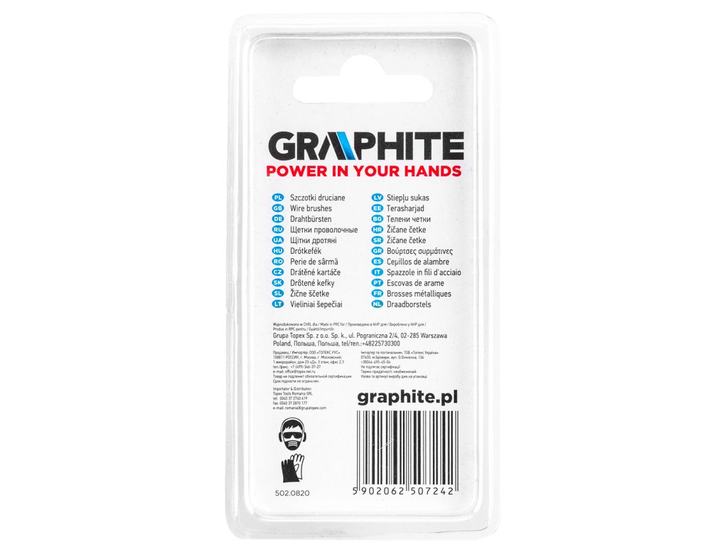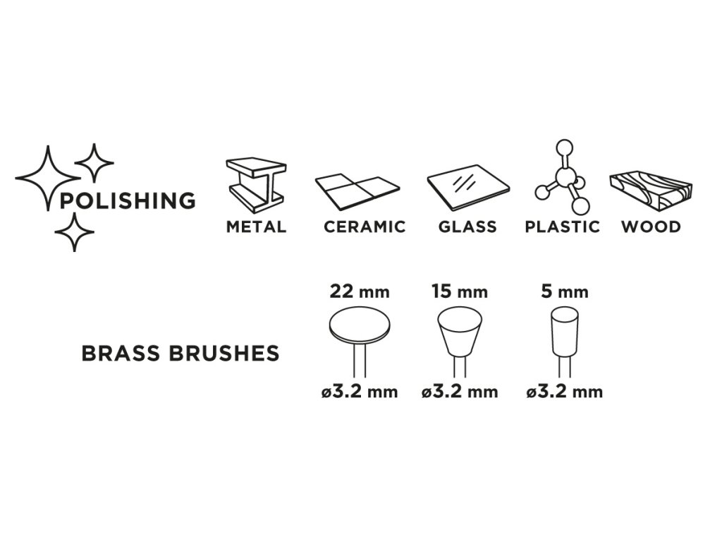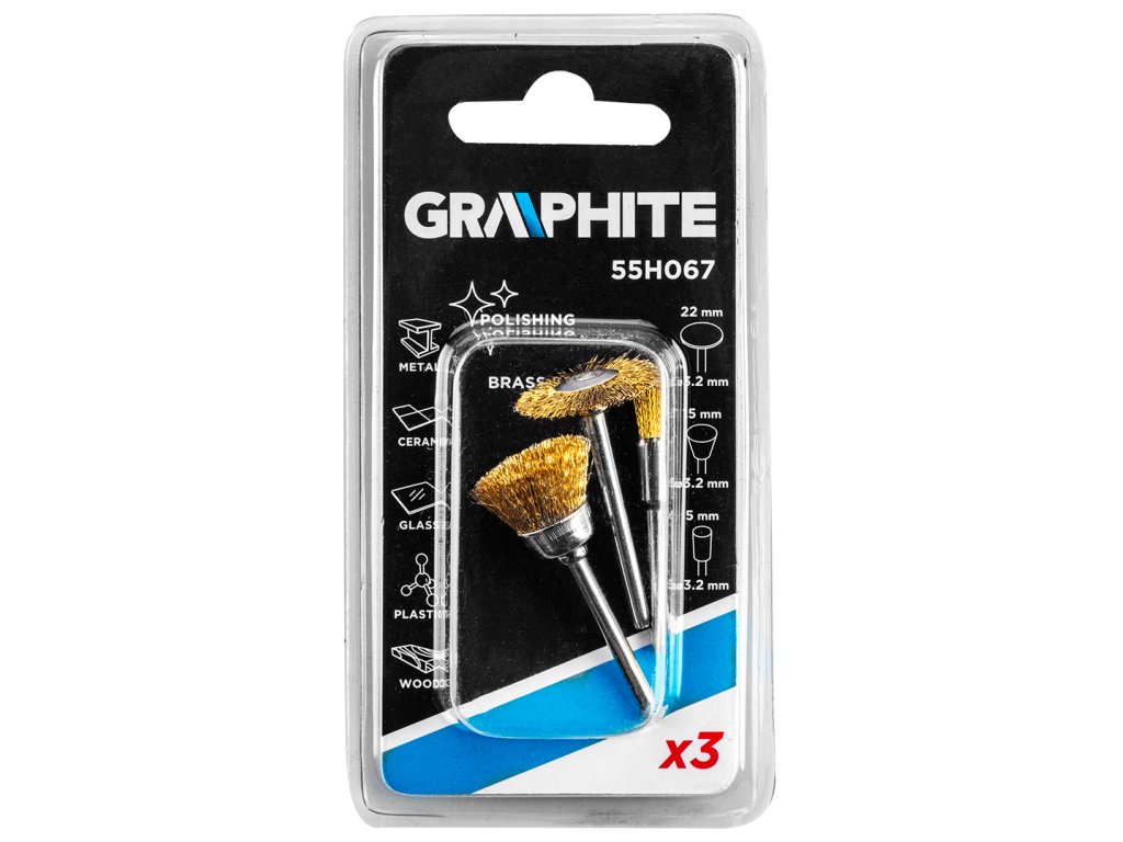 Mosadzné kefy GRAPHITE (ref. č. 55H067) je sada 3 kief pre minibrusky v týchto tvaroch: kefa (priemer 5 mm), pohár (priemer 15 mm), kotúč (priemer 22 mm). Sú vyrobené z mosadzného drôtu. Kefy sú určené na odstraňovanie nečistôt, vysávanie, leštenie a prípravu povrchov z dreva alebo kovu.