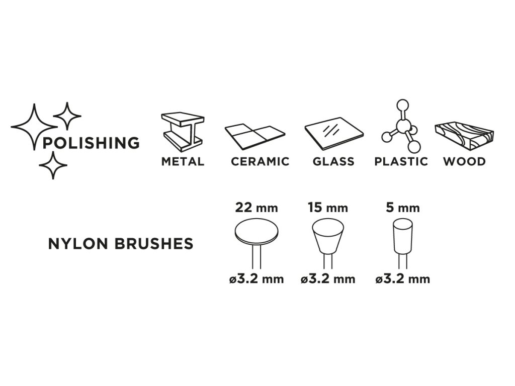 Nylonové kefy GRAPHITE (ref. 55H068) je sada 3 kief pre minibrúsku v tvare: kefa (priemer 5 mm), pohár (priemer 15 mm), kotúč (priemer 22 mm). Sú vyrobené z nylonového drôtu. Kefy sú určené na odstraňovanie nečistôt, vysávanie, leštenie a prípravu povrchov z chúlostivých materiálov.