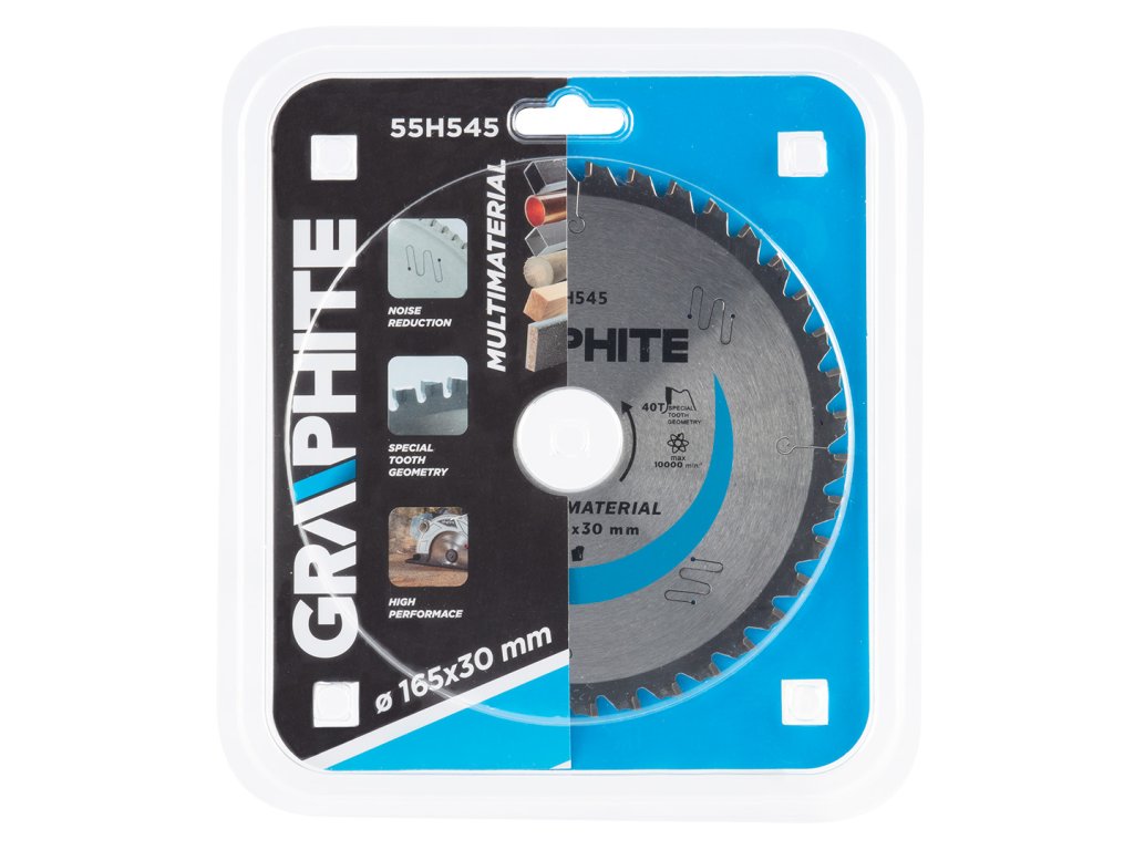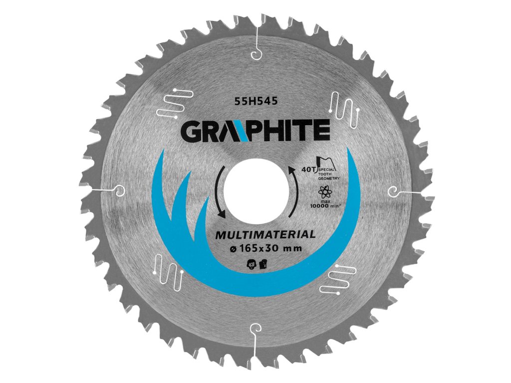 pílový kotúč GRAPHITE WIDIA (ref. 55H545) s vonkajším priemerom 165 mm a vnútorným priemerom 30 mm má 40 zubov a umožňuje vyššiu rýchlosť rezania. Čepeľ je založená na špeciálnej konštrukcii ozubenia a použití špeciálneho karbidu. Univerzálny nôž, ktorý sa nemusí vymieňať pri zmene rezaného materiálu. Zuby FWF vďaka svojej špeciálnej konštrukcii a širokej hrebeňovej časti poskytujú záruku odolnosti voči zaťaženiu. Vhodné na rezanie rôznych materiálov, ako sú oceľové a hliníkové profily a iné neželezné kovy, napríklad meď, plasty, drevo s malými klincami, OSB dosky, preglejky, konáre, lamináty atď. Použitie kompenzačných zárezov znižuje hladinu hluku a drážky zvyšujú stabilitu noža a presnosť rezu. Kotúčová píla WIDIA na čisté rezy.