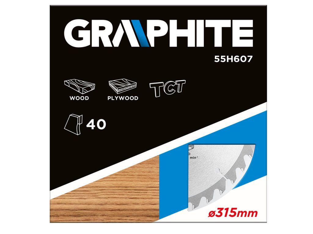 Vidiový pílový kotúč GRAPHITE (ref. č. 55H607) s priemermi 315 mm, vyrobený zo zliatny mangánovej ocele MN65 s vysokou odolnosťou proti teplote a deformácii. Zuby s nástrčkami z tvrdých zliatin uhlíka YG6A umožňujú hrubé rezanie dreva a materiálov na báze dreva, ako je preglejka, drevotrieska, MDF. Redukčné krúžky obsiahnuté v balení umožňujú použitie kotúča pre väčšinu modelov píl.