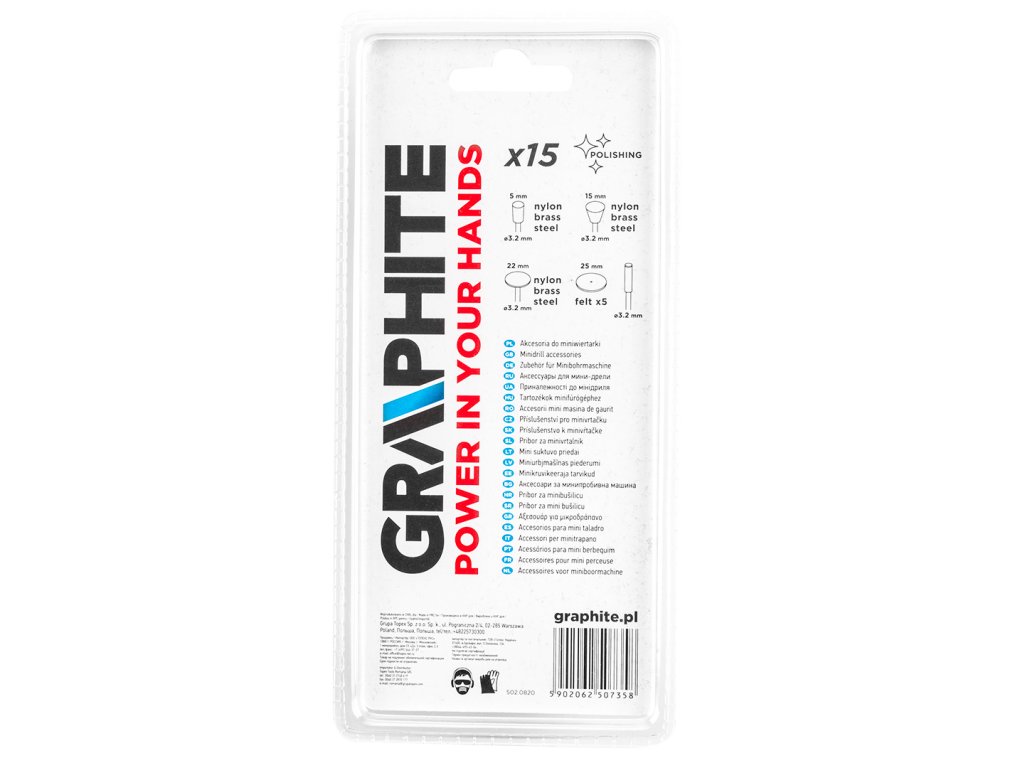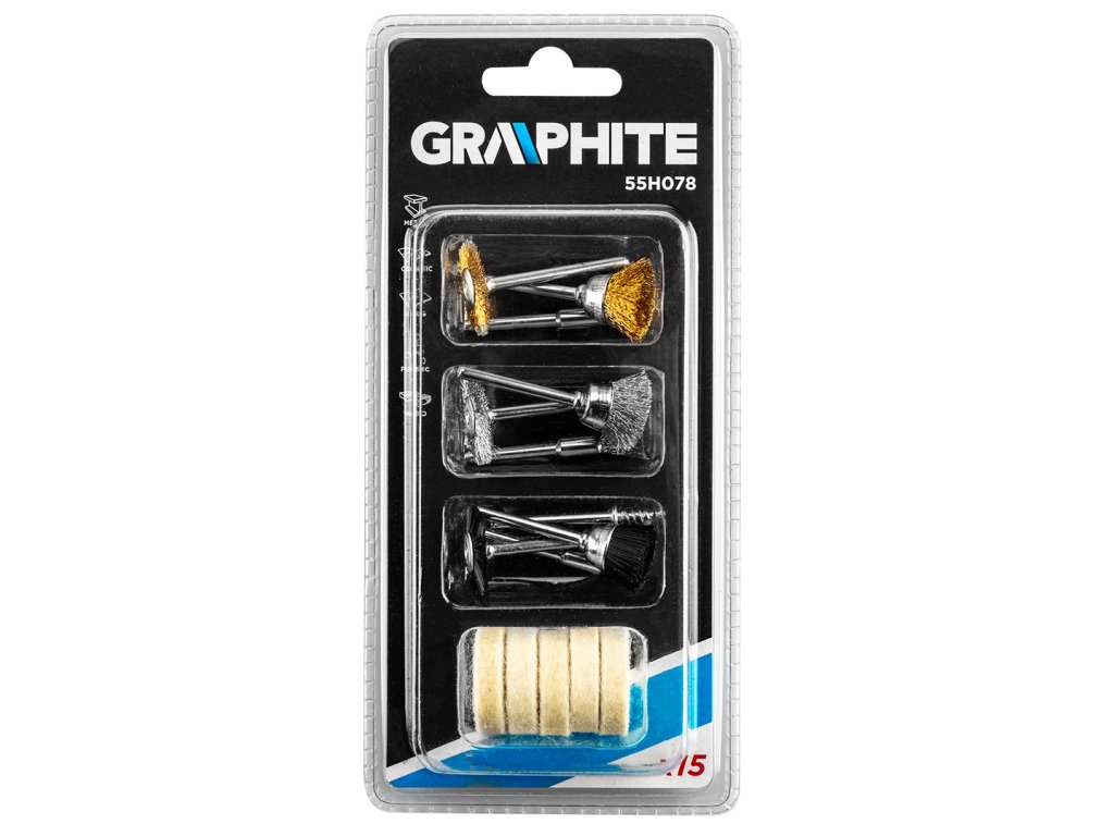 Príslušenstvo pre minibrúsku GRAPHITE (ref. 55H078), sada obsahuje 15 leštiacich nástrojov. Sú určené na použitie s minibrúskou. Vhodný na leštenie, vyhladzovanie a brúsenie väčšiny materiálov. Vhodné na použitie na: kovy, odliatky, zvárané spoje, nity, odstraňovanie hrdze, keramiku, sklo, drevo, plasty.