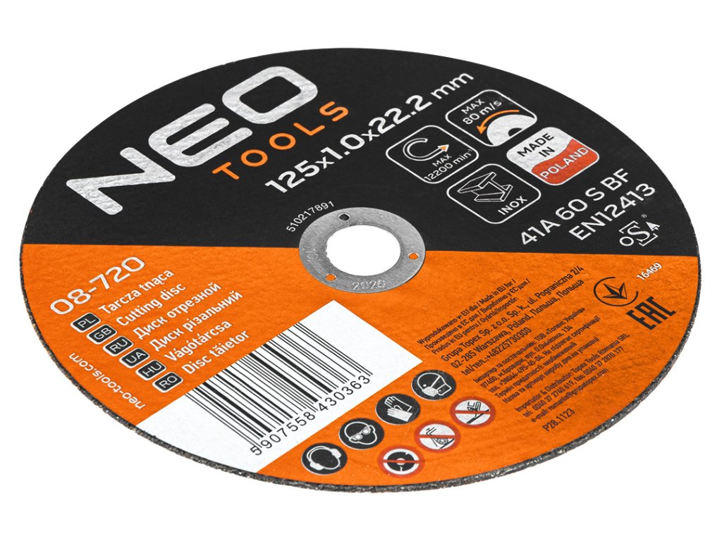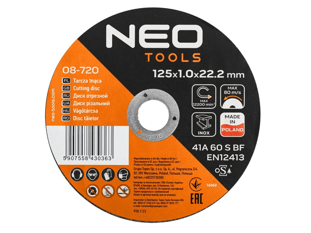 Kotúče na rezanie kovov 41 A 60 S BF -125 x 1,0 x 22,2 STAL/INOX, 100 kusov vo vedre 08-722 od spoločnosti NEO TOOLS je sada 100 kotúčov na rezanie kovov poľskej výroby ponúkaná vo výhodnom vedre. Rezné kotúče 41 A 60 S BF sa vyznačujú priemerom 125 mm, hrúbkou 1 mm a montážnym otvorom 22,2 mm. Dosahujú maximálne 12 200 otáčok za minútu. Odporúča sa na oceľ vrátane ocele INOX. Sú ideálne ako nástroje na profesionálne aj hobby použitie.