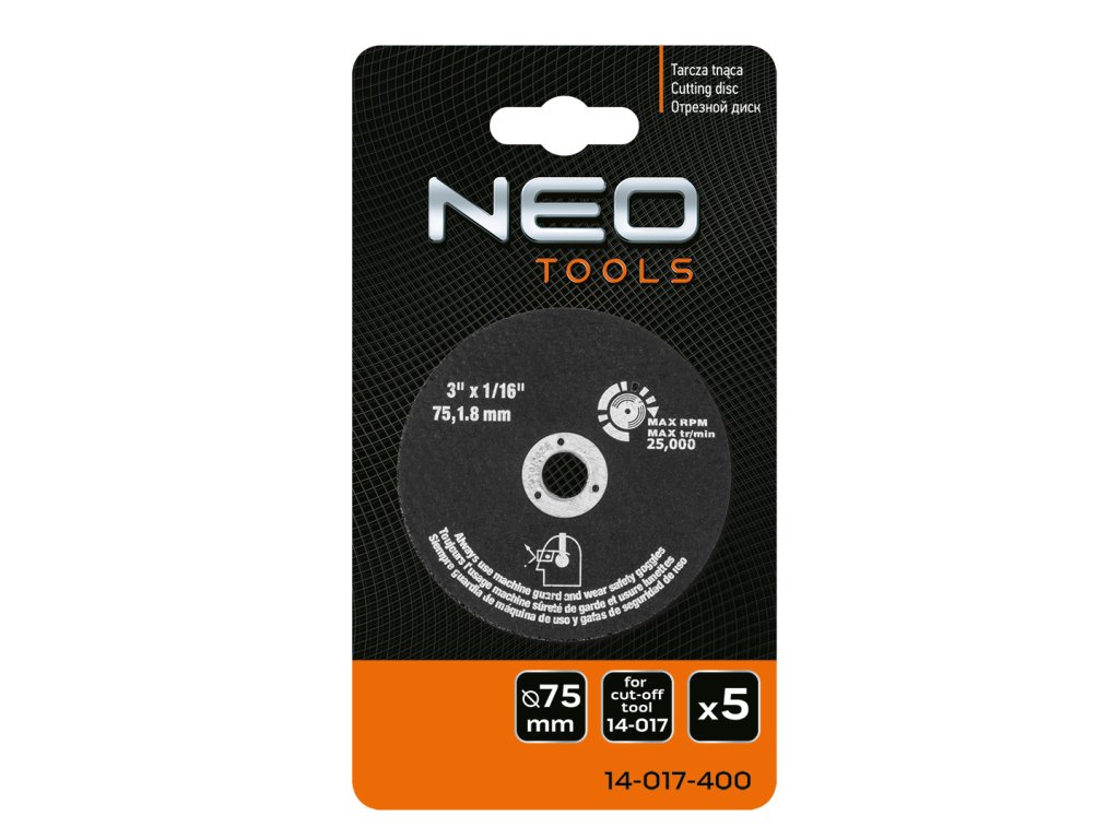 Rezný kotúč pre 14-017, sada 5 ks, 14-017-400 od spoločnosti NEO je sada piatich kotúčov kompatibilných so 75 mm pneumatickou frézou NEO 14-017. Kotúč je určený na presné rezanie karosérií, plechových dielov a kovových konštrukcií. Odporúča sa pre autoservisy a priemyselné práce.