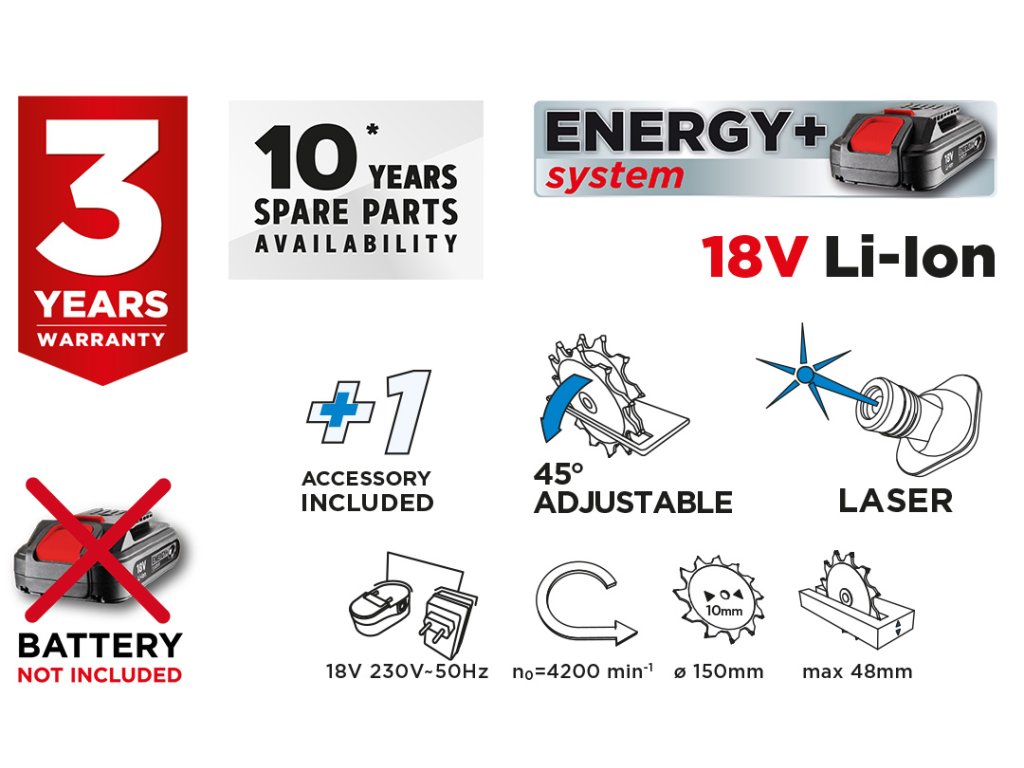 Akumulátorová kotúčová píla 18 V, Li-Ion, kotúč 150 x 10 mm, otáčky 4200 min??, rezanie pod uhlom 0-45?, hĺbka rezania 48/36 mm (90/45?), laserový ukazovateľ, rozmery zariadenia (LxH) 325 x 260 mm, hmotnosť 2,5 kg, príslušenstvo: paralelné vodidlo, hexagonálny kľúč