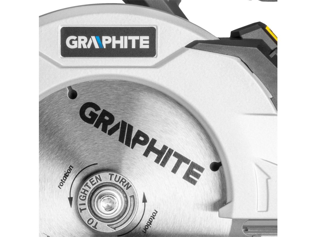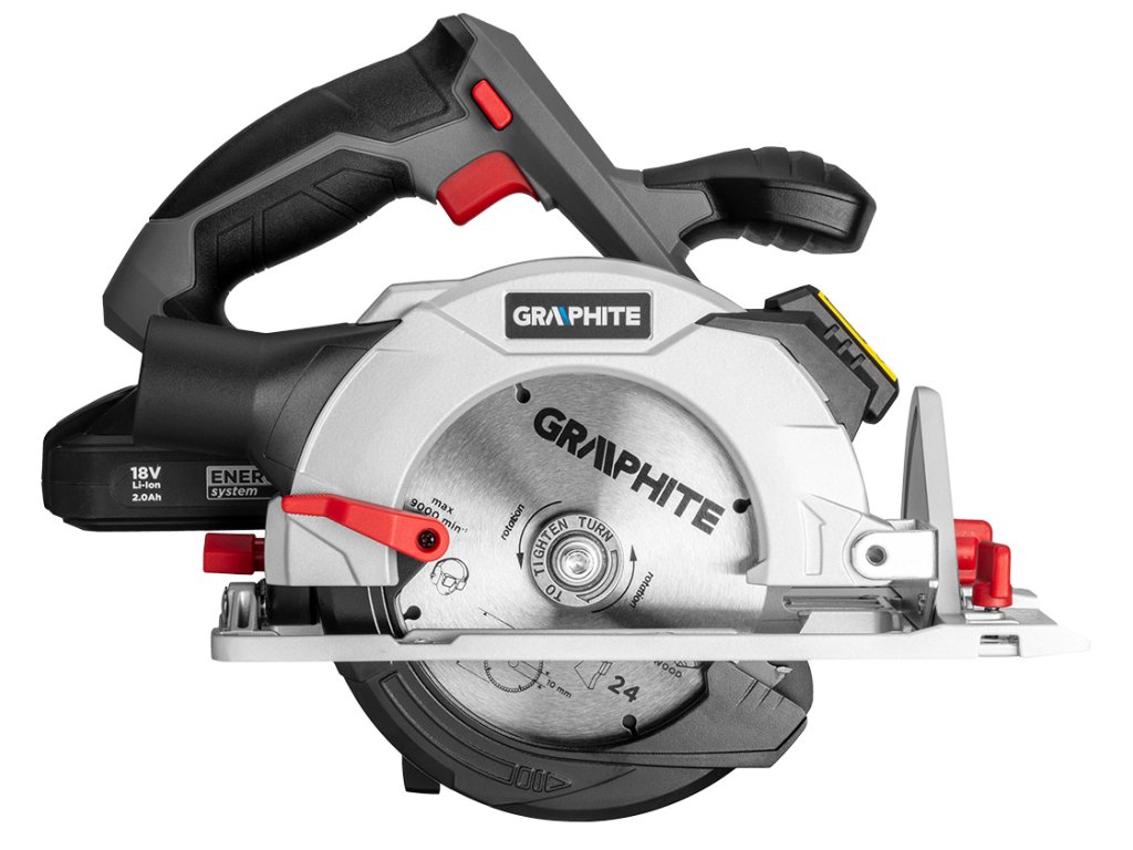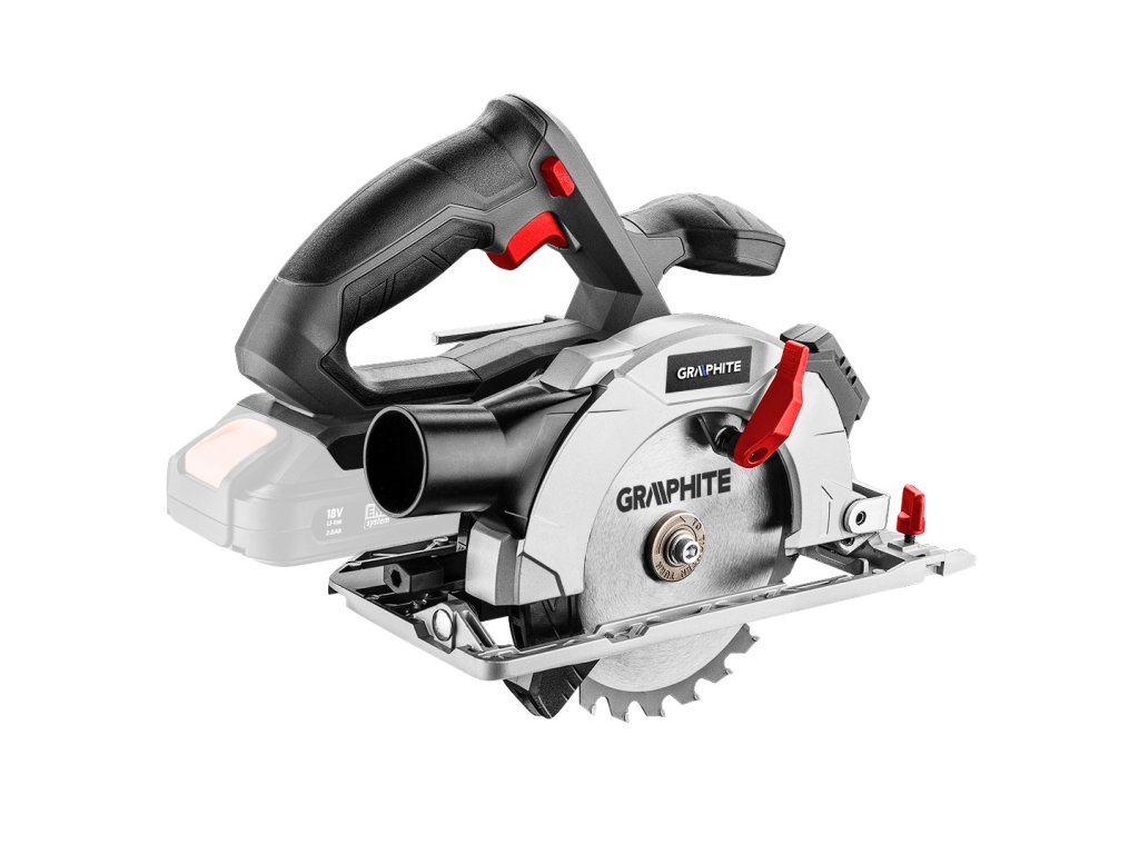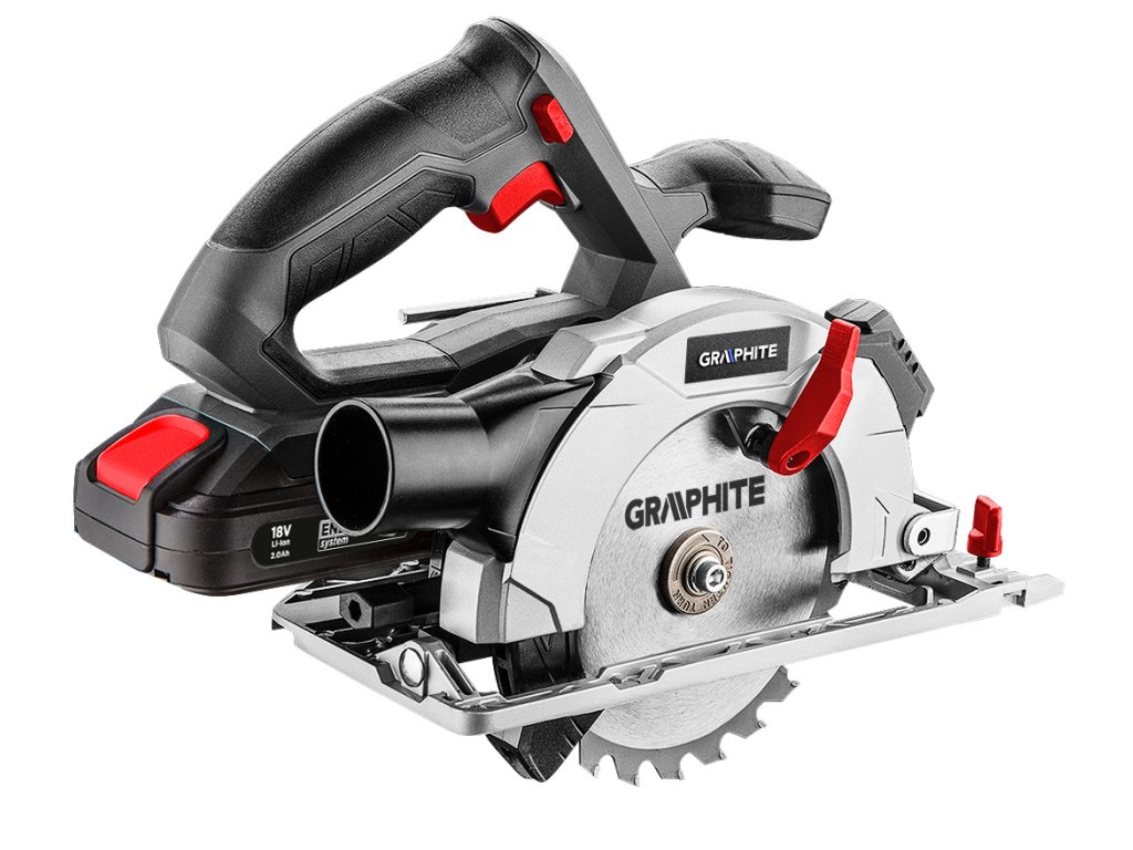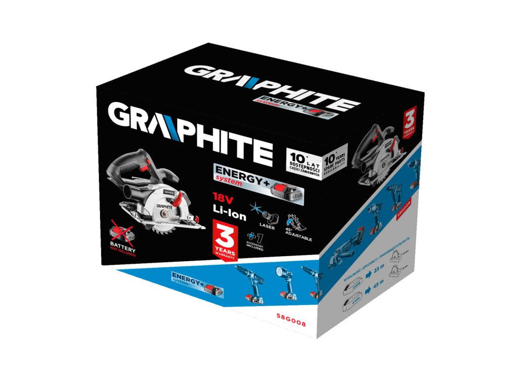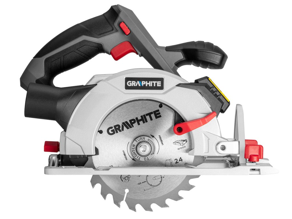 Kotúčová píla GRAPHITE, spolupracuje s akumulátormi 18 V Li-Ion GRAPHITE Energy+. Píla má možnosť rezania pod uhlom v rozsahu od 0° do 45°. Maximálna hrúbka rezaného materiálu je do 48 mm. Nastavenie uhla a hĺbky rezania prebieha bez použitia náradia. Píla spolupracuje s pílovými kotúčmi s vonkajším priemerom 150 mm a priemerom otvoru 10 mm. Rýchlosť otáčania kotúča pri behu naprázdno je 4200 ot./min. Píla je vybavená rukoväťou s blokovaním na ochranu pred náhodným zapnutím, pokrytou protišmykovým materiálom, vďaka čomu je práca pohodlná a bezpečná. Má pripojenie na odsávanie prachu a laserový ukazovateľ. Pätka a vrchný kryt kotúča sú z odolnej zliatiny hliníka. V súprave s pílou sa nachádza paralelné vodidlo a hexagonálny kľúč.