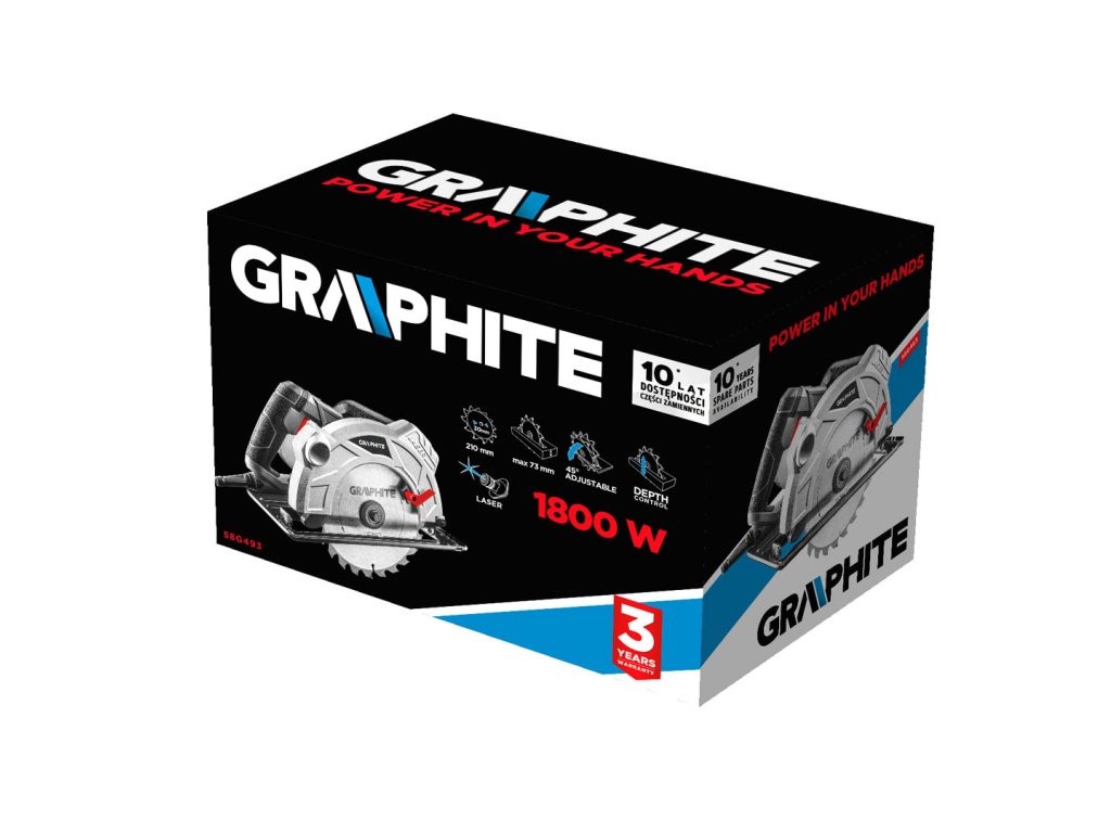 Kotúčová píla GRAPHITE s motorom s výkonom 1800W, ktorý umožňuje prácu s rýchlosťou do 5000 otáčok za minútu. Zariadenie je prispôsobené na prácu s kotúčmi s vonkajším priemerom 210 mm a umožňuje rezanie do materiálov s hrúbkou do 73 mm. Existuje aj možnosť rezania pod uhlom do 45°. Nastavenie uhla a hĺbky rezania sa vykonáva bez použitia nástrojov - na nastavenie parametrov slúžia špeciálne stupnice. Bezpečnosť obsluhujúcej osoby zabezpečuje dvojstupňový spínač na ochranu pred náhodným spustením. Pohodlnú a bezpečnú manipuláciu s elektrickým zariadením zaručuje dodatočná strmeňová rukoväť so širokou plochou uchopenia. Na mieste viditeľnom pre obsluhujúcu osobu sa nachádza indikátor s informáciou o pripojení elektrického zariadenia do siete a jeho pripravenosti na prácu. Hlavný kryt kotúča je vyrobený zo zliatiny hliníka. Laserový ukazovateľ integrovaný so zariadením uľahčuje určovanie smeru rezania. Paralelné vodidlo v príslušenstve umožňuje precízne vedenie píly pozdĺž okraja materiálu. Zariadenie je vybavené pružným a odolným napájacím káblom v gumovom obale s dĺžkou 3 m, ktorý je tiež určený na profesionálne a priemyselné použitie tak v interiéri, ako aj v exteriéri.