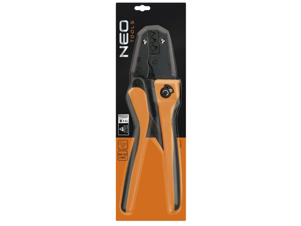 Kliešte na lisovanie neizolovaných svoriek NEO (ref. 01-502), dĺžka 250 mm. Pre hroty v rozsahu 22-12 AWG. Tvrdosť lisovacích čeľustí 48-52 HRC. Rukoväť pokrytá kvalitným materiálom TPR zvyšuje pohodlie pri práci. Kvalitu nástroja potvrdzuje certifikát TÜV a 25-ročná záruka výrobcu. Značka NEO spĺňa očakávania profesionálov.