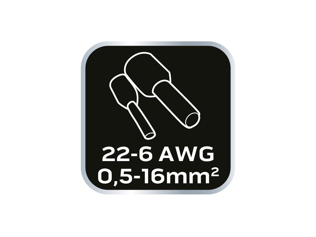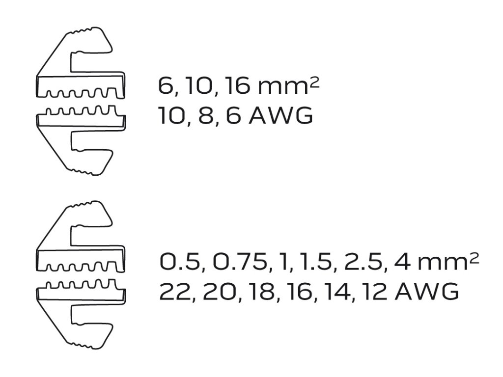 Lisovacie kliešte na koncovky 0.5-16 mm2 (22-6 AWG), 220 mm, 42 HRC, 2 vymeniteľné krimpovacie hlavy z CrMo ocele, TÜV