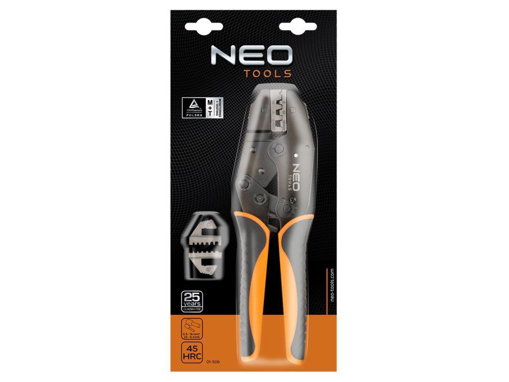 Krimpovacie kliešte NEO na koncovky puzdier (ref. 01-506), dĺžka 220 mm. S vymeniteľnými hlavicami na lisovanie neizolovaných svoriek. Hlavice sú vyrobené z odolnej chróm-molybdénovej ocele s tvrdosťou 45 HRC. Ergonomická rukoväť z dvoch materiálov zvyšuje pohodlie pri práci. Kvalita náradia potvrdená certifikátom TÜV a 25-ročnou zárukou výrobcu. Značka NEO spĺňa očakávania profesionálov.