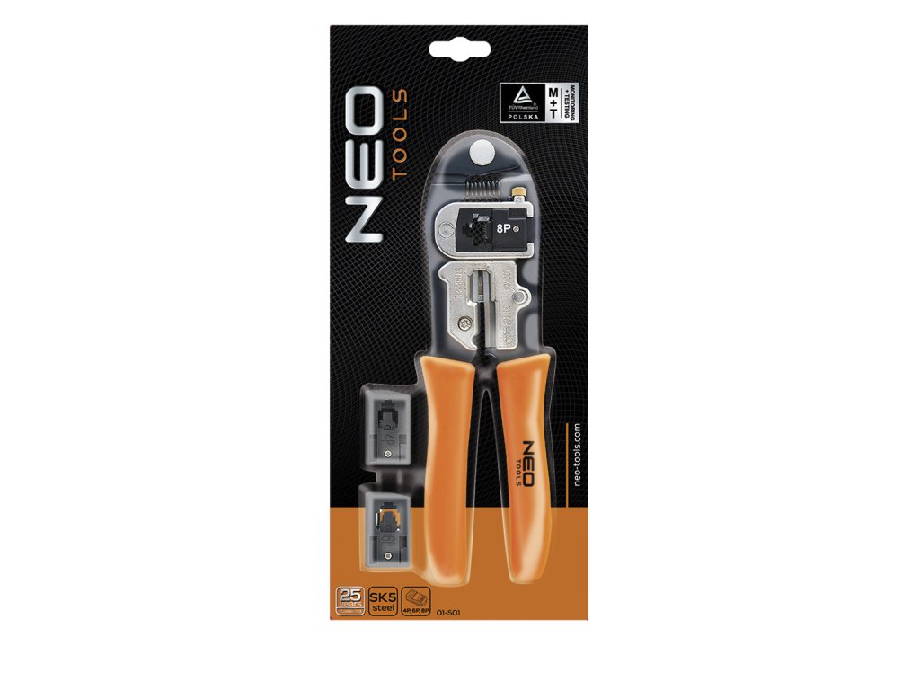 NEO kliešte s telefónnym hrotom (ref. 01-501) s dĺžkou 195 mm. S vymeniteľnými hlavicami na lisovanie 4P, 6P, 8P svoriek. Rezné čepele sú vyrobené z odolnej ocele SK5, tvrdosť 42-48 HRC. Rukoväť potiahnutá kvalitným plastom TPR zvyšuje pohodlie pri práci. Kvalitu nástroja potvrdzuje certifikát TÜV a 25-ročná záruka výrobcu. Značka NEO spĺňa očakávania profesionálov.