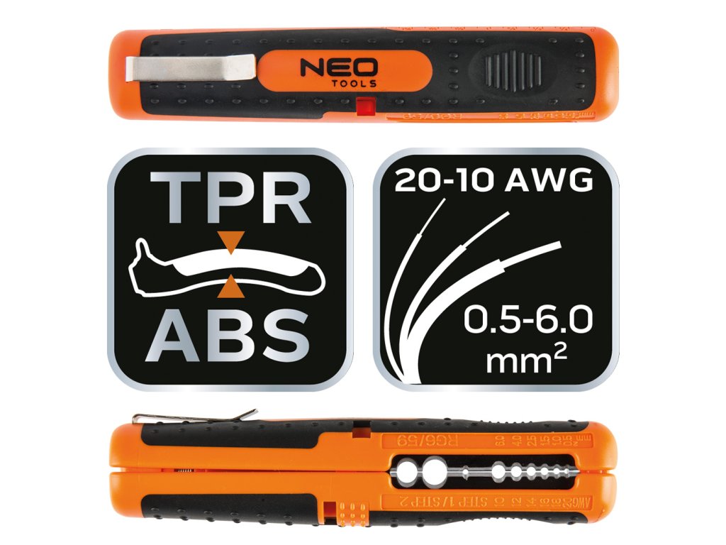 Sťahovák izolácie NEO s dĺžkou 180 mm. Pre káble s prierezom 0.5 - 6 mm? (AWG 10-20) a 8 - 13 mm?. Sťahovák pre koaxiálne káble RG6 / 59. Má mierku v centimetroch a palcoch. Dvojzložková, nekĺzavá rukoväť s TPR a ABS zvyšuje komfort. Vybavený vreckovým klipom. Značka NEO spĺňa očakávania odborníkov.