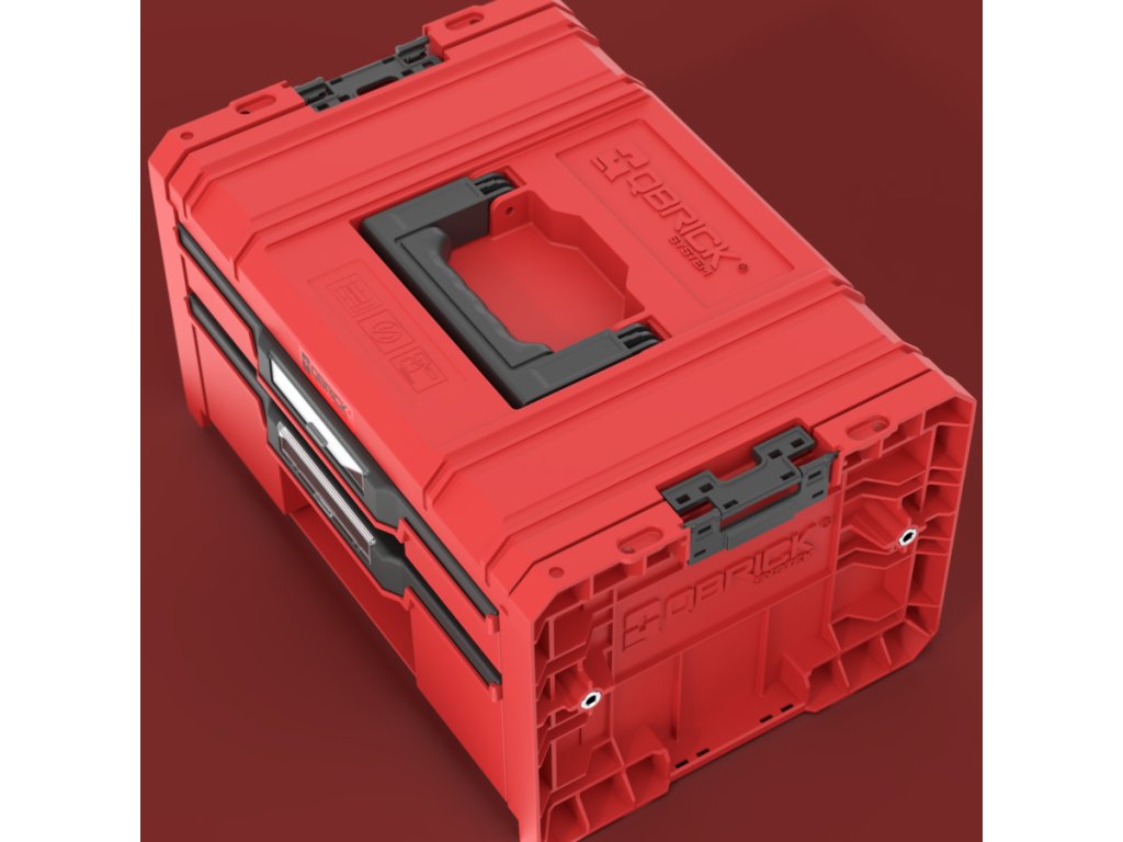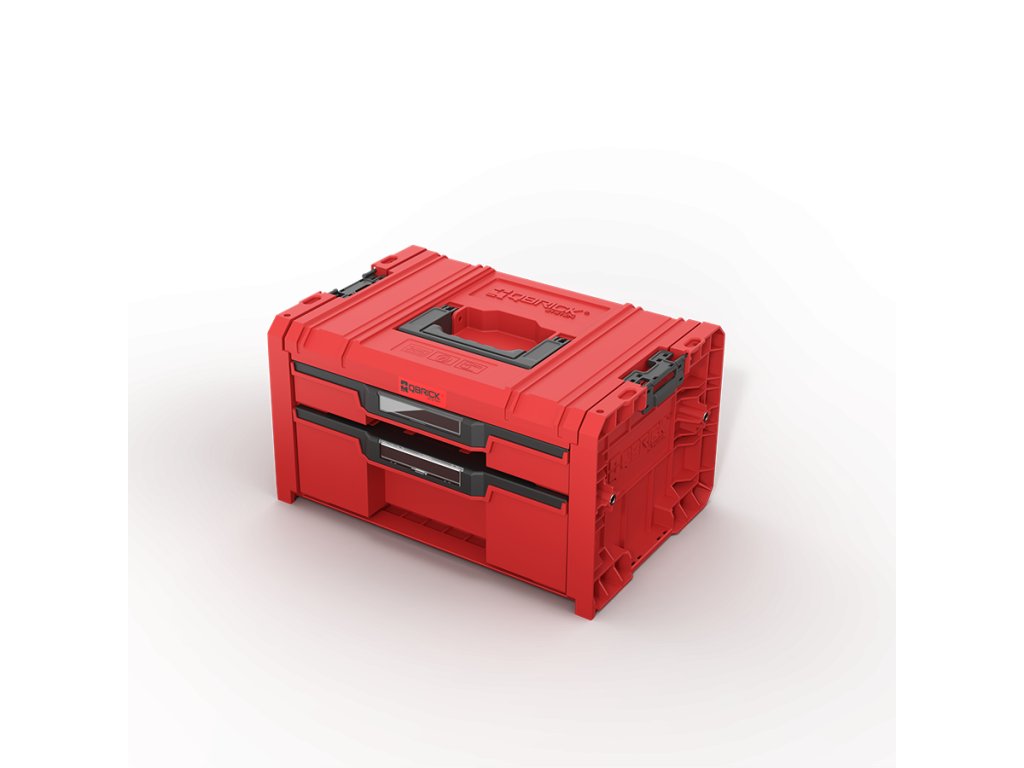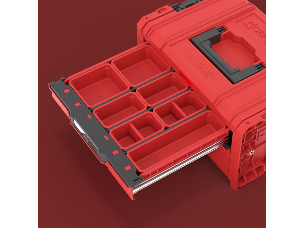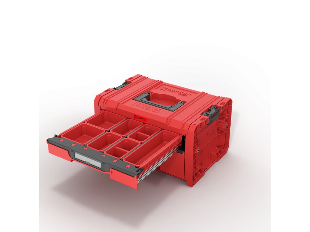 Qbrick System PRO Drawer 2 Toolbox Expert RED Ultra HD je priestranná modulárna náradová skrinka vybavená dvomi zásuvkami vysúvanými na kovových koľajničkách. Pohodlné tlačidlo umožňuje rýchly prístup k ich obsahu.