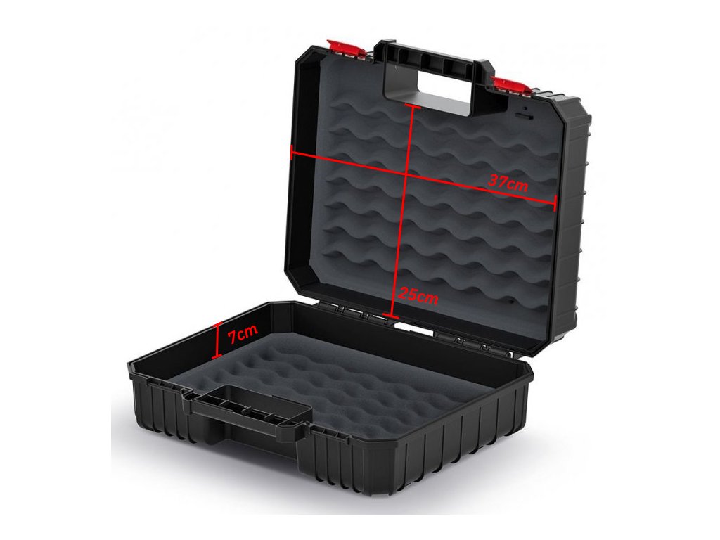 Kufor na náradie do dielne s kovovými zámkami a vnútornými priehradkami s penovou výplňou, proti mechanickému poškodeniu. Praktický pomocník, ktorý Vám pomôže udržať v garáži/dielni poriadok. Je vhodný aj pre profesionálov.
