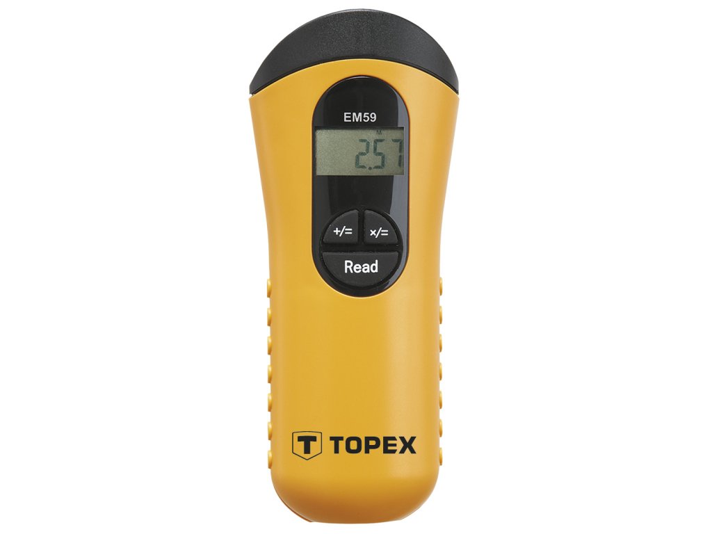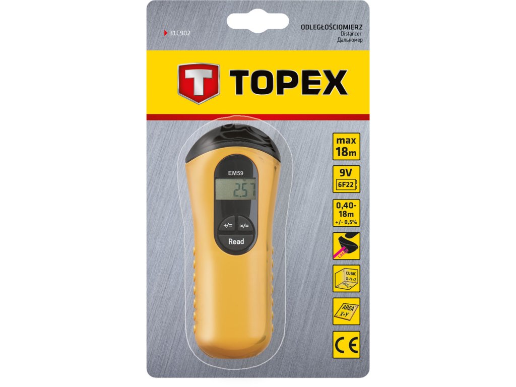Ultrazvukový merač vzdialenosti TOPEX (ref. 31C902) s rozsahom merania 0,4 - 18 m a presnosťou 0,5 %. Tento jednoduchý prístroj na odhad vzdialeností má aj funkciu na sčítanie meraní alebo výpočet miestností. Telo je vyrobené z odolného plastu. Súlad s európskymi bezpečnostnými normami zaručuje certifikát CE. Značka TOPEX je určená pre domácich majstrov.