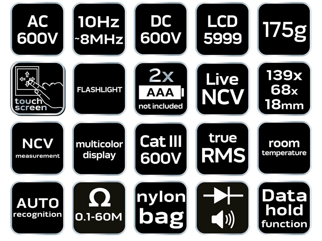 Digitálny farebný merač, podsvietený LCD displej max. 5999, dotykový panel, baterka, funkcia automatického rozpoznania, detekcia elektrického poľa NCV, true RMS, funkcia hold, napájanie 2xAAA (nie je súčasťou balenia), hmotnosť 175g, rozmery 139x68x18mm, frekvencia 10Hz-8MHz, teplota okolia, odpor 0.1-60M ?, striedavé napätie 600V, jednosmerné napätie 600V, kat. II 600V, zvukový signál, funkcia spojitosti obvodu, dve sondy, klip na šnúrku