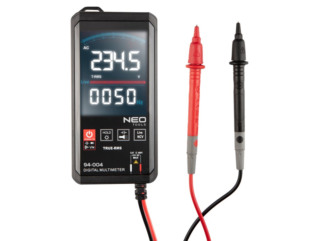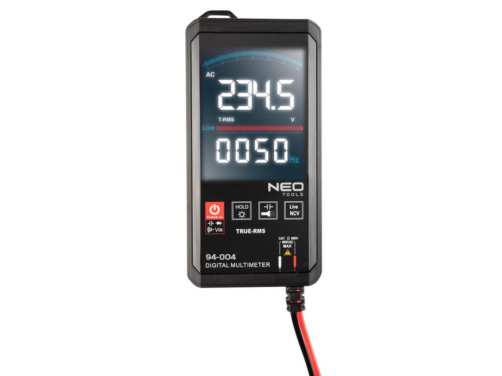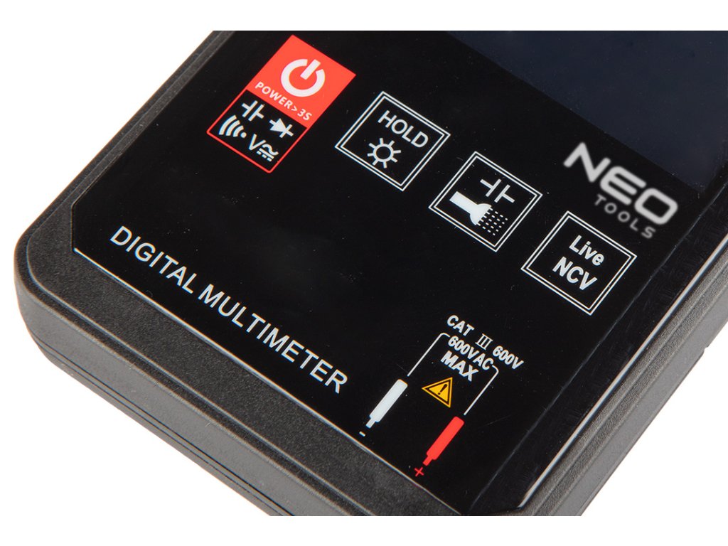 Digitálny merač 94-004 od spoločnosti NEO je zariadenie s podsvieteným LCD displejom s hodnotou až 5999. Je vybavený dotykovým panelom, praktickou baterkou a dvoma meracími sondami na pohodlnú obsluhu. Digitálny farebný merač je vybavený funkciou automatického rozpoznania, detekciou elektrického poľa NC, funkciou podržania a kontinuity obvodu. True RMS zvyšuje možnosti zariadenia. Frekvencia je 10 Hz - 8 MHz a odpor sa určuje v rozsahu 0,1 - 60 M ?. Napätie merača je AC 600V, DC 600V, Cat II 600V. Prístroj zobrazuje okolitú teplotu a má zabudovaný zvukový signál a praktickú šnúrku na zavesenie na šnúrku. Jeho rozmery sú 139x68x18 mm a váži len 175 g. Merač je napájaný 2xAAA (nie sú súčasťou dodávky). Toto je presný nástroj od spoločnosti NEO pre profesionálov a domácich majstrov.