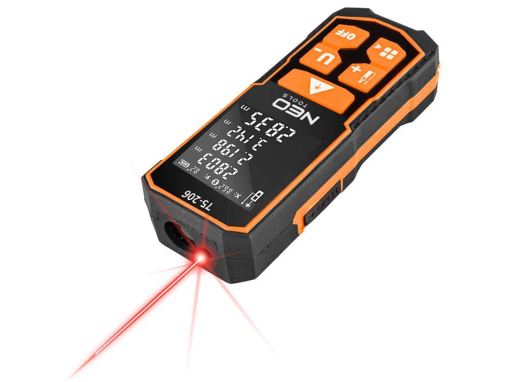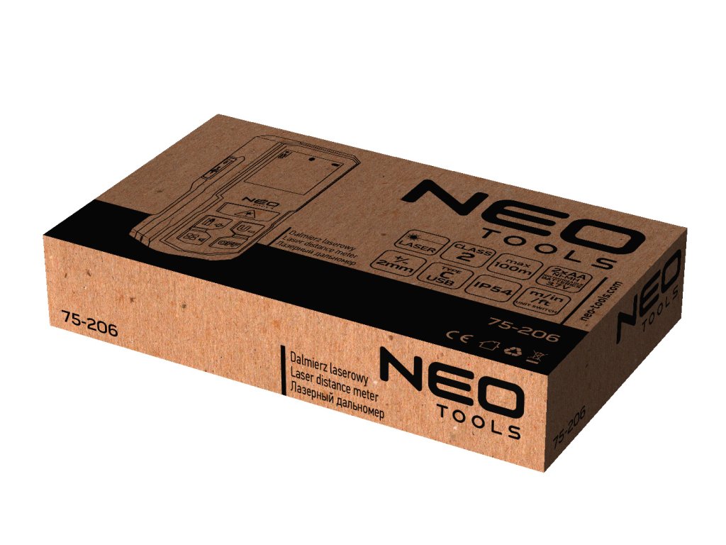 Laserový merač vzdialenosti NEO (ref. 75-206) s maximálnym dosahom 100 m je zariadenie na meranie vzdialenosti, plochy a objemu. Funkcie diaľkomera umožňujú aj nepriame meranie (pomocou Pytagorovej vety), spojité meranie, sčítanie a odčítanie, meranie maxima a minima. Merania možno vykonávať od začiatku, stredu a konca zariadenia a v troch merných jednotkách: m/in/ft. Okrem toho je zariadenie vybavené automatickou vodováhou, ktorá umožňuje priebežne odčítavať uhol polohy diaľkomera. Má pamäť na posledných 30 meraní. Presnosť merania je +/- 2 mm. Zariadenie má stupeň ochrany IP54 a certifikát CE. Diaľkomer je vybavený nastaviteľnou hlasitosťou. Napája sa dvoma nabíjateľnými batériami typu AA NI-MH alebo dvoma alkalickými batériami typu AA. Sada obsahuje nabíjací kábel USB typu C a náramok.