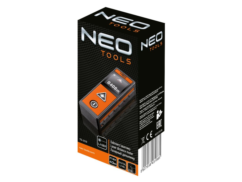 Laserový diaľkomer značky NEO (ref. č. 75-203) je vysokokvalitné zariadenie slúžiace na meranie vzdialenosti, plochy, objemu. Funkcie diaľkomera umožňujú vykonávať nepriame merania (prostredníctvom Pytagorovej vety) a nepretržitých meraní. Prístroj je navyše vybavený automatickou vodováhou, ktorá umožňuje priebežné čítanie uhla polohy zariadenia. Maximálny dosah zariadenia je 40 m a presnosť merania +/- 2 mm/10m. Produkt je praktický pre použitie v stavebníctve, geodézii, pri technických projektoch, ako aj pri práci doma. Zariadenie je prispôsobené na prácu pri teplotách v rozsahu od 0 °C do 40 °C. Diaľkomer je vybavený moderným dotykovým displejom. Súlad s európskymi bezpečnostnými normami dokladá certifikát CE. Značka NEO spĺňa očakávania odborníkov.