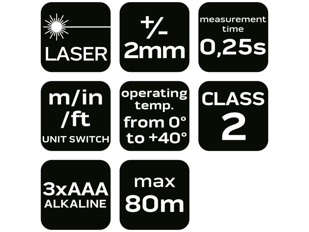 Diaľkomer, IP54, rozsah 0,05 - 80 m, dĺžka laserového lúča 620~690 nm, 3 alkalické batérie typu AAA, pamäť na posledných 50 meraní, 2. trieda, meracie jednotky: m/in/ft, meranie vzdialenosti, meranie plochy, objemu, kontinuálne meranie, Pytagoras, sčítanie a odčítanie, maximálne a minimálne meranie, možnosť merania od začiatku a konca prístroja, elektronický uhlomer 0-90 stupňov, náramok na zápästie, puzdro, batérie