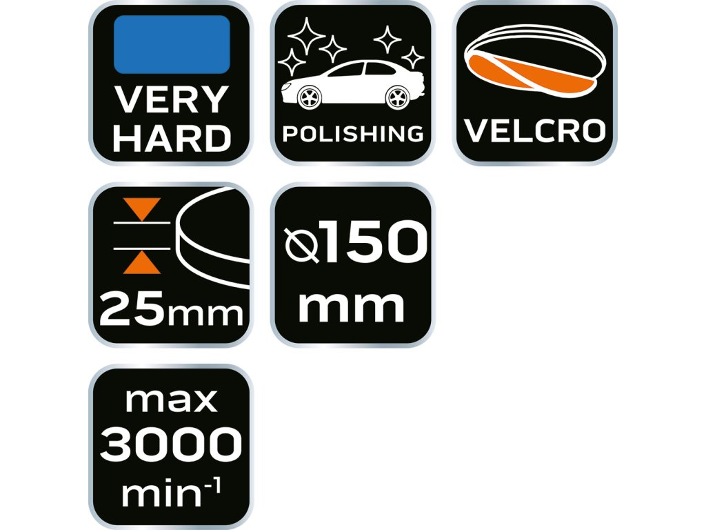 Leštiaci kotúč/podložka s montážou na suchý zips. Extra tvrdá špongia špongia. Rozmer: 150x150mm, hrúbka: 25mm.