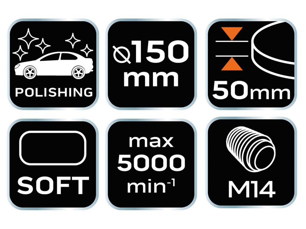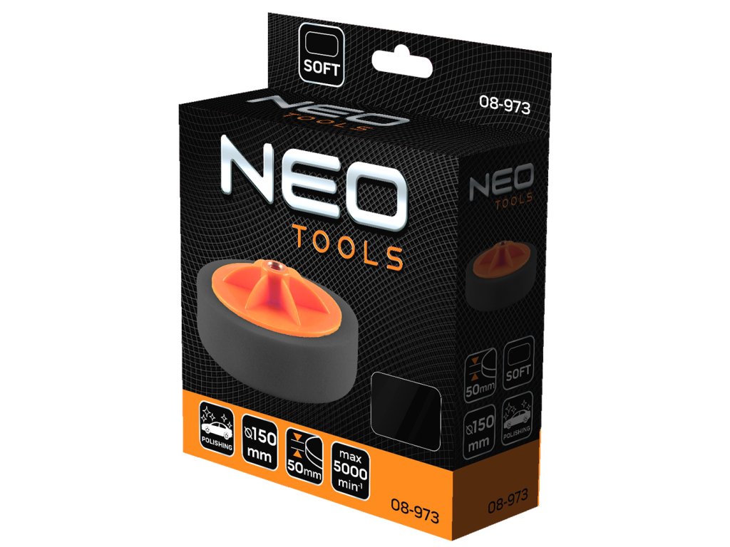 Leštiaci kotúč NEO (ref. 08-973), priemer 150 mm, s hrúbkou huby 50 mm, upevnený na závite M14. Vyrobené z polyuretánovej peny. Navrhnuté na prácu s rotačnými leštičkami. Určené na veľmi ľahké opravy laku. Odporúča sa používať pri maximálnych otáčkach 5000 ot/min.