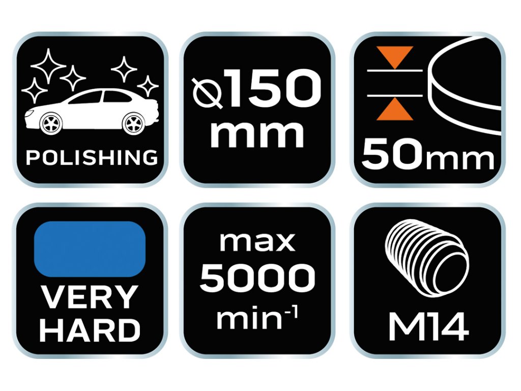 Leštiaci kotúč/podložka s montážnym závitom M14. Veľmi tvrdá špongia. Priemer: 150mm, hrúbka: 50mm.