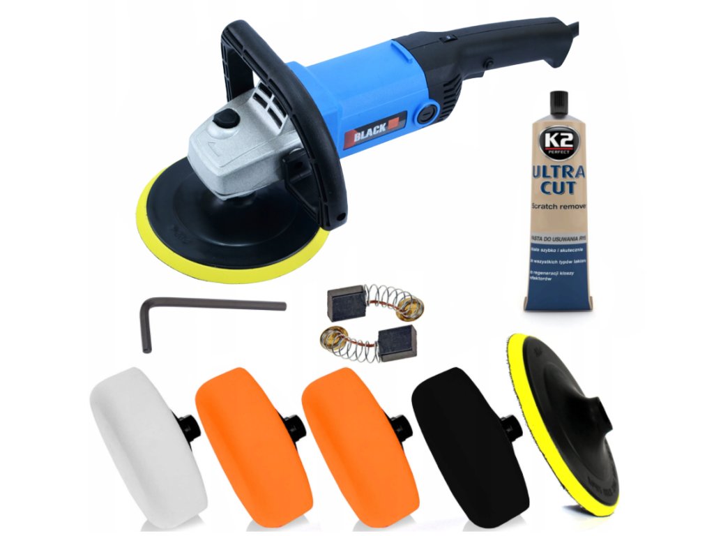 Profesionálny výsledok leštenia zabezpečia leštiace kotúče rôznych stupňov tvrdosti. Kotúč so suchým zipsom umožňuje upnutie priloženej handričky na leštenie ale aj iných brúsnych a leštiacich prvkov. V balení aj pasta K2 Ultra Cut na odstránenie škrabancov a nedokonalostí laku.