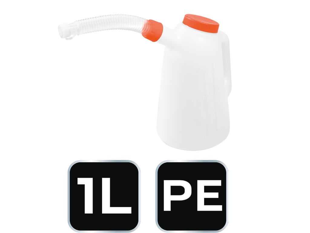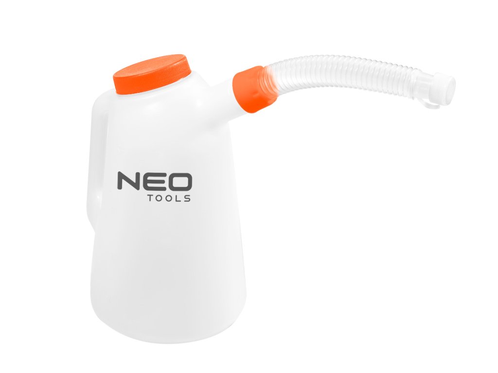 Dielenská plnička značky NEO s objemom 1 l, kanva na polievanie, 1 l 10-802 je výrobok s objemom 1 l, ktorý sa vyznačuje praktickým plniacim uzáverom a flexibilným koncom s uzáverom. Je vyrobená z odolného PE odolného voči prevádzkovým kvapalinám. Dielenská plnička NEO je vybavená skrutkovacím viečkom. Na jej boku sa nachádza ľahko čitateľná stupnica na odčítanie a dávkovanie kvapalín. Viečko a krúžok oranžovej farby sú pre používateľov dobre viditeľné. Výrobok sa odporúča pre domácich majstrov aj profesionálov.