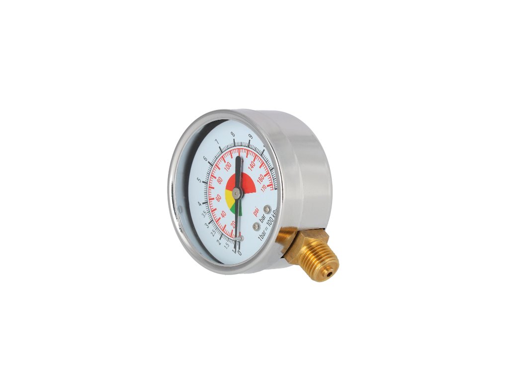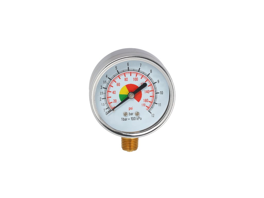 Barometer s priemerom 63 mm pre kompresory s rozsahom merania 0-12 bar. Spodné pripojenie samec 1/4".