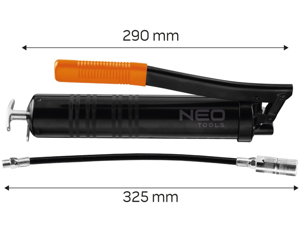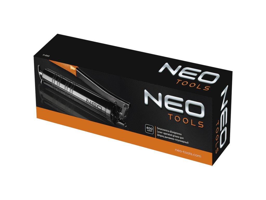 Páková mazacia pištoľ NEO (ref. 11-500) s objemom 400 cm3. Zariadenie je pripravené na použitie bez potreby dokupovania príslušenstva. Súprava obsahuje pevnú kovovú rúrku 150 mm, ohybnú hadicu 300 mm a koncovku so štyrmi čeľusťami. Umožňuje vysokotlakové mazanie mechanických častí. Vyrobené z vysoko kvalitnej ocele, ktorá zaručuje dlhoročnú životnosť. Značka NEO spĺňa očakávania profesionálov.