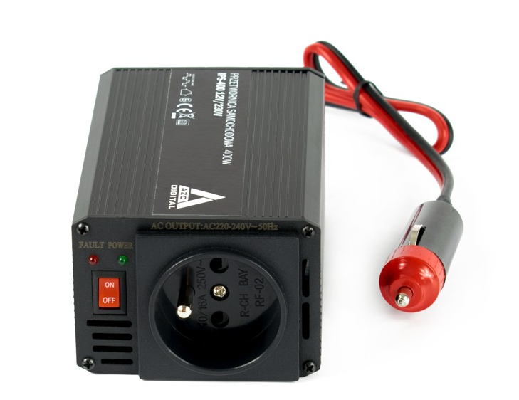 Menič napätia do automobilu IPS 12/230V 200W IPS-400. Funguje ako prevodník prúdu z 12 V na 230 V. Umožňuje pripojiť elektrické zariadenie k napr. autobatérii.