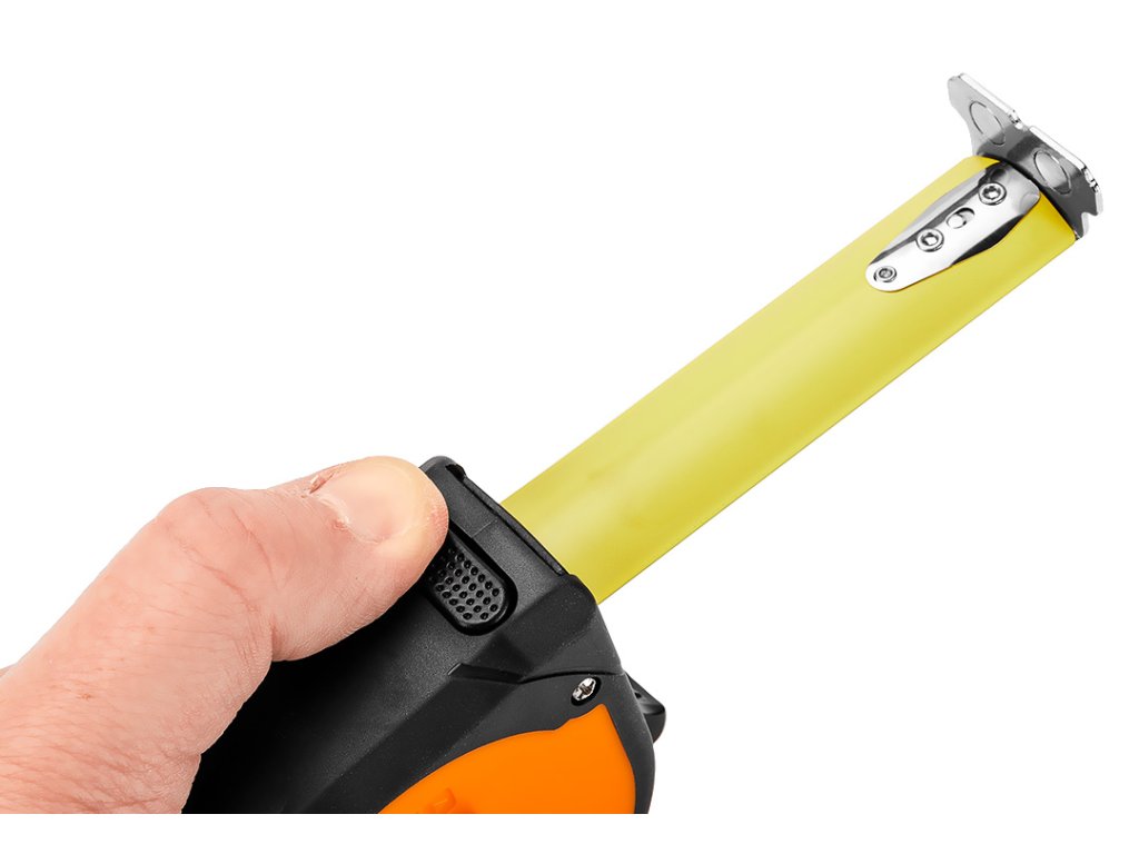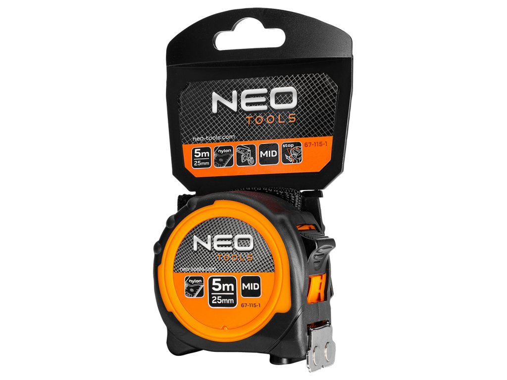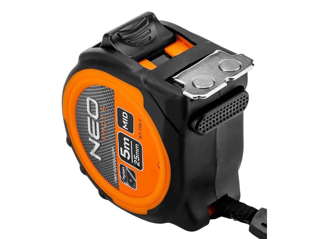 Oceľový rolovací meter 5 m x 25 mm, magnet 67-115-1 od spoločnosti NEO je praktický nástroj s dĺžkou 5 m a šírkou pásky 25 mm s dvoma praktickými zámkami na zasúvanie. Jeho nylonový poťah chráni výtlačok pred odieraním. Magnetický hrot a profil pásky uľahčujú meranie. Tlmič nárazov pri zaťahovaní pásky chráni háčik pred zlomením. Ergonomický tvar puzdra umožňuje bezpečné a pohodlné uchopenie a protišmykový materiál zaručuje pohodlie a bezpečnosť pri práci. Spoľahlivosť zaručuje jeho výroba v súlade so smernicou EÚ MID triedy II pre meracie prístroje. Značka NEO spĺňa očakávania profesionálov.