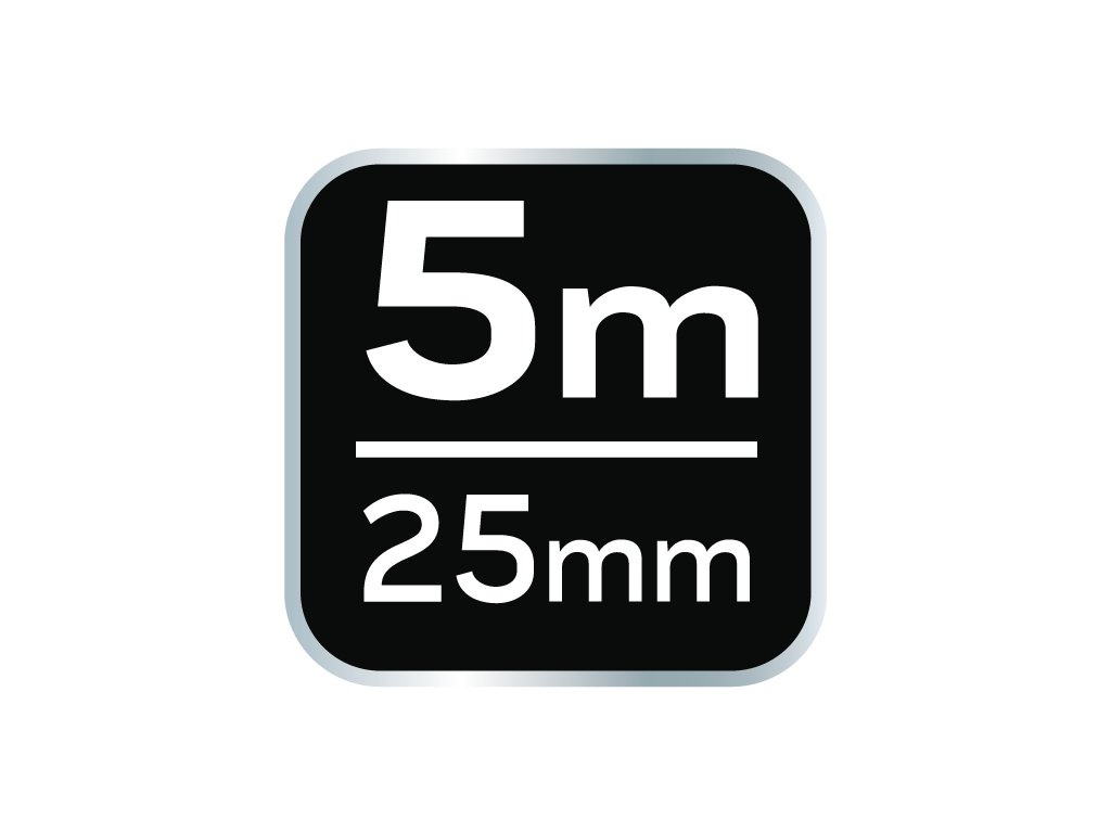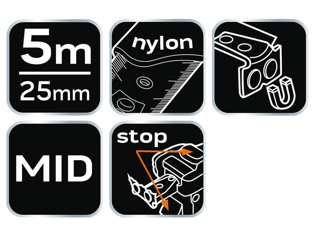 Oceľový meter 5 m x 25 mm, magnetický koniec, dva zámky navíjania pásky, puzdro z dvoch materiálov, nylonový povlak na ochranu značiek mierky pred odieraním, tlmič nárazov pri navíjaní pásky, certifikát MID