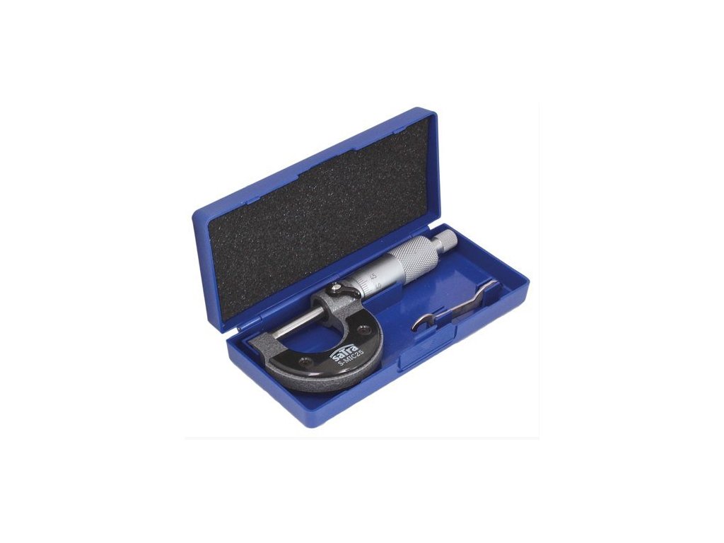 Mikrometer s rozsahom merania od 0 do 25 milimetrov a presnosťou až 0,01 mm.