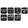 Jumpstarter zariadenie, pomoc pri štarte do 400A, powerbanka 14Ah - dve USB zásuvky typu A (1A a 2A) , kompresor 100W - do 3.5BAR - odčítanie a nastavenie tlaku, LED svietidlo