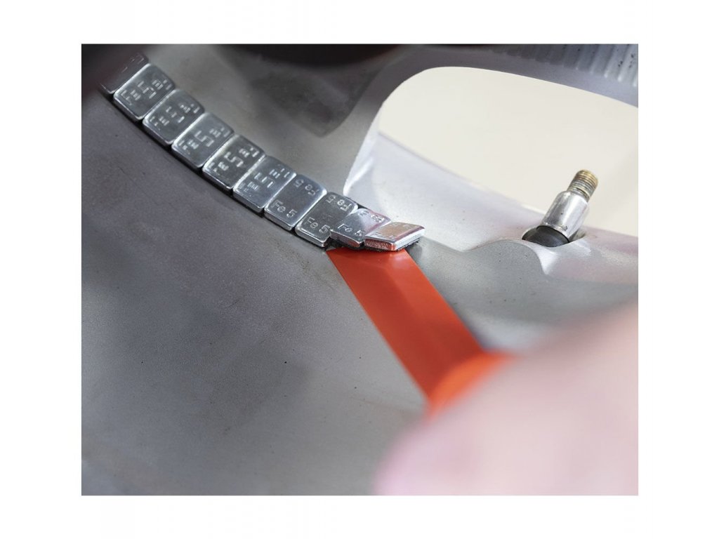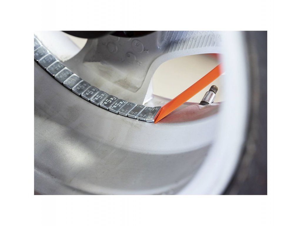 Prípravok je určený na odstránenie starých samolepiacich závaží z hliníkových diskov. Vďaka svojmu tvaru a predĺženému tŕňu škrabka dokonale priľne k okraju a presne vyváži hmotnosť závažia, ktoré odstráni rýchlo, bez akéhokoľvek poškodenia alebo poškrabania disku. Tento prípravok nesmie chýbať v žiadnej dielni, alebo servise. Škrabka je vyrobená z kompozitného materiálu, ktorý zaručuje jej dlhú výdrž. Špeciálne tvarovaná masívna rukoväť sa v rukách nebude šmýkať. Škrabka znesie aj vysoké pracovné zaťaženie.