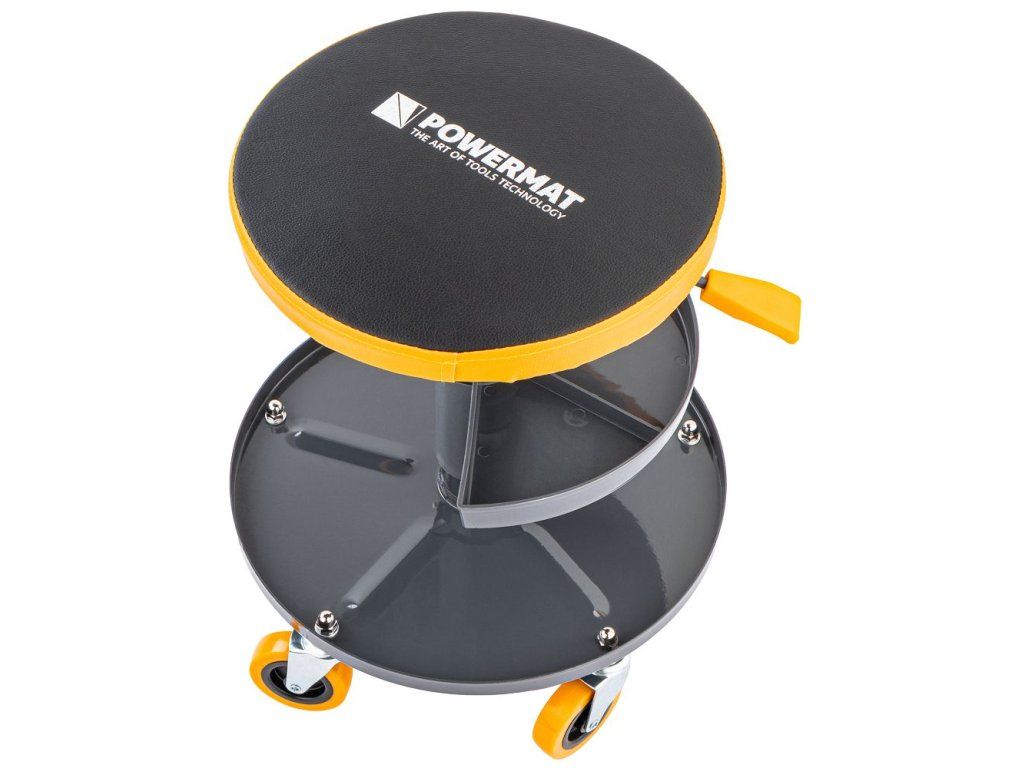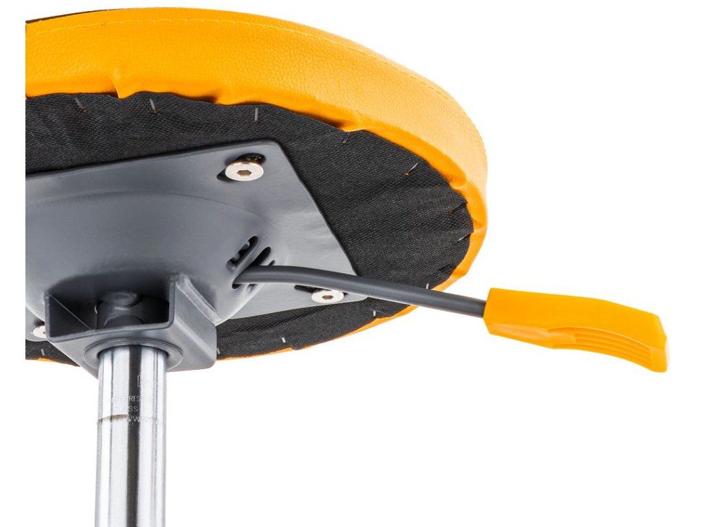 Stolička je vybavená okrúhlym sedadlom s priemerom 30 cm a hrúbkou 3 cm, ktoré poskytuje dostatočný komfort aj pri dlhšom sedení. Robustná konštrukcia a kompaktné rozmery 35,5 × 40 cm zaručujú stabilitu a zároveň jednoduché umiestnenie aj v menších dielňach alebo garážach.