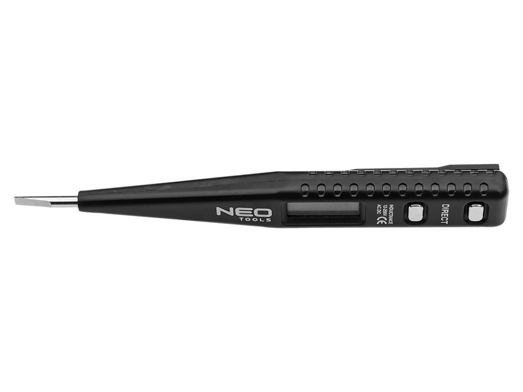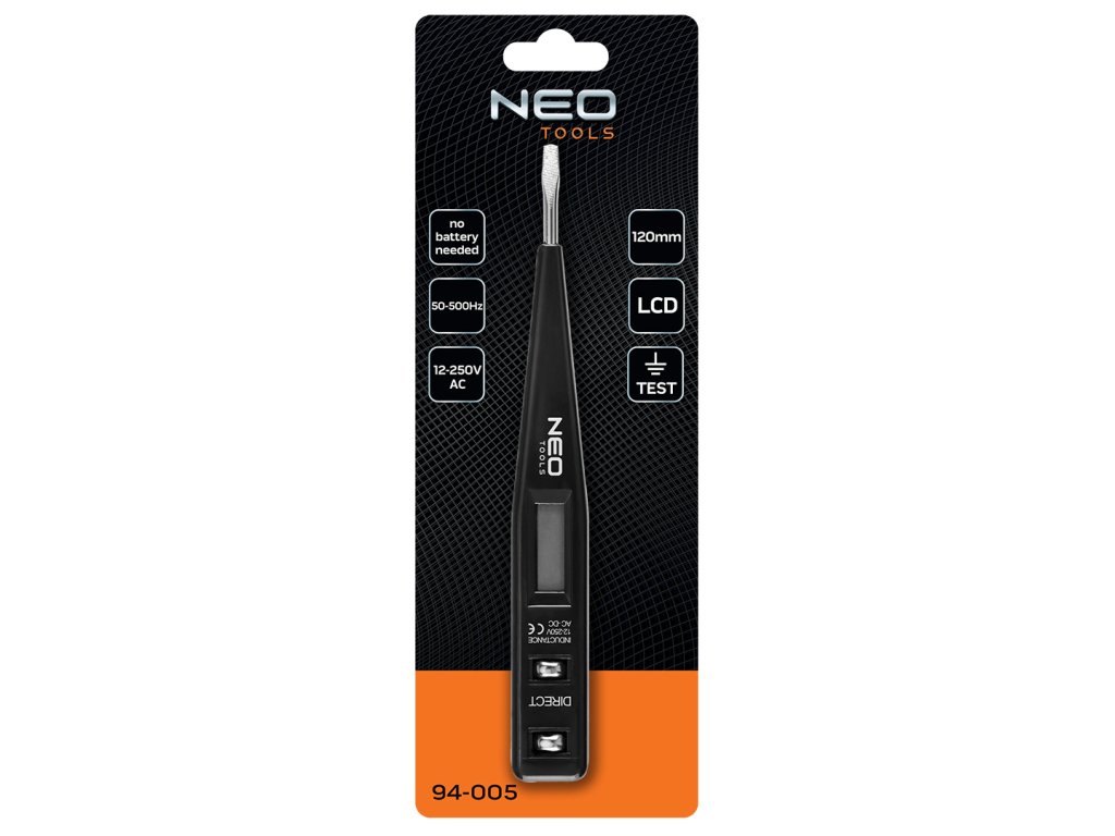 Digitálna skúšačka napätia 12-250 V 94-005 od spoločnosti NEO, ktorá podporuje rozsah napätia 12-250 V AC a frekvenciu 50-500 Hz. Vyznačuje sa celkovou dĺžkou 120 mm. Určená na kontrolu hodnôt napätia v zásuvkách, lokalizáciu porúch v izolovaných striedavých kábloch a kontrolu fázy v striedavých elektrických zásuvkách. Je vybavený plochým hrotom, takže je použiteľný aj ako plochý skrutkovač. Skúšačka napätia značky NEO má praktický LCD displej. Vyznačuje sa tým, že nepotrebuje batériu. Je to nástroj, ktorý uľahčí nájdenie poruchy v elektrickej inštalácii.